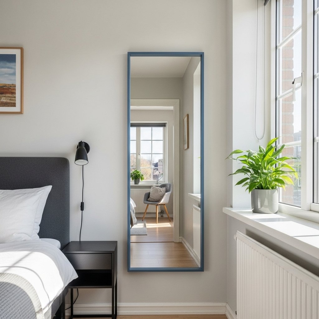Mirrors are essential for small bedrooms as they reflect light and create the illusion of space. A mirror with a subtle blue frame or a decorative mirror with a hint of blue can tie the color scheme together. Position mirrors opposite windows to maximize natural light, making the room feel brighter and more open. This functional yet stylish addition contributes to both the aesthetic and the cozy atmosphere of the bedroom.