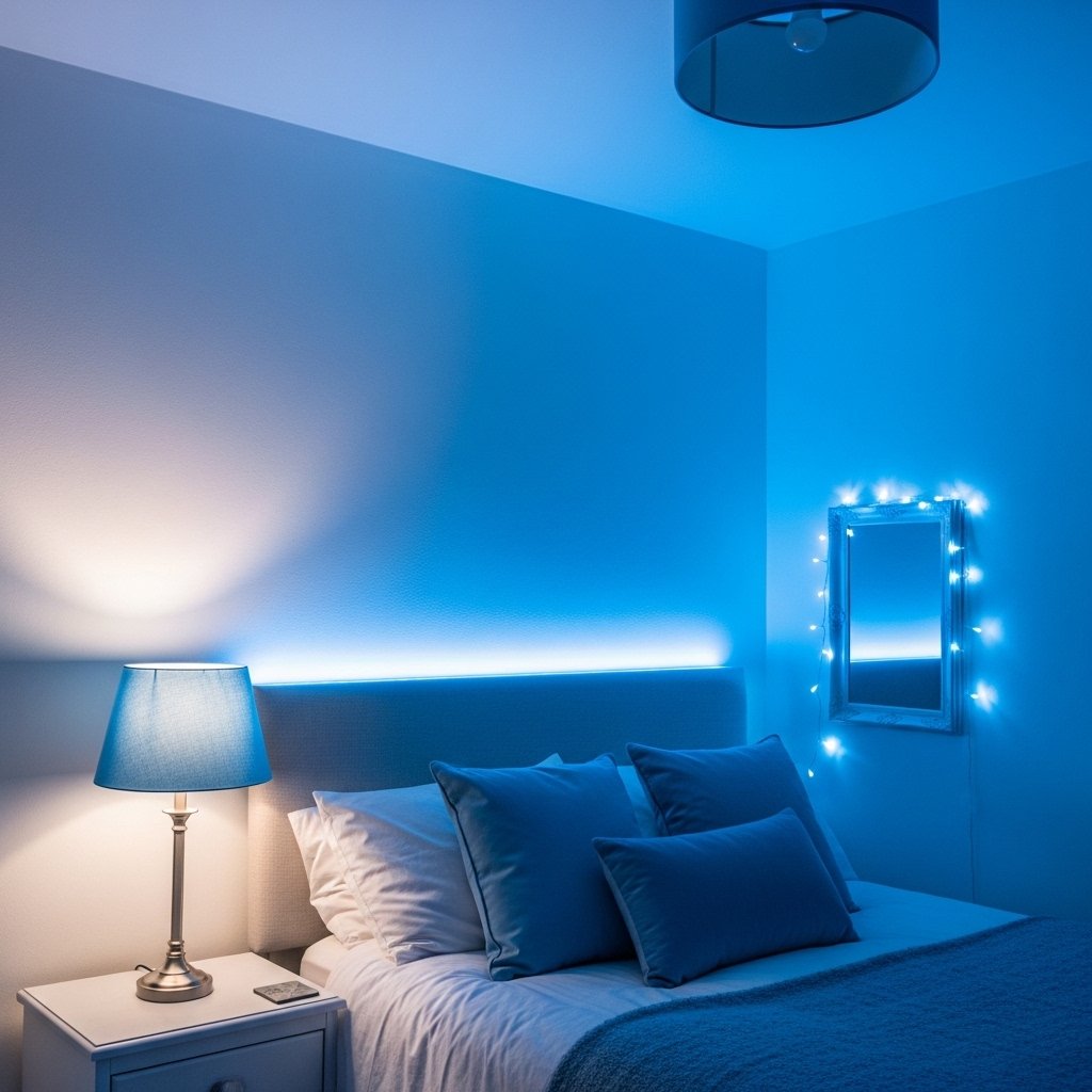 Lighting plays a major role in creating a cozy atmosphere, and blue-tinted lights can enhance the theme. Consider using soft blue lampshades, LED strips, or fairy lights to cast a gentle, calming glow. Avoid overly bright or harsh lighting that can make a small room feel cold. Layering ambient, task, and accent lighting ensures that your blue-themed bedroom is both functional and relaxing. This subtle lighting strategy completes the cozy vibe perfectly.
