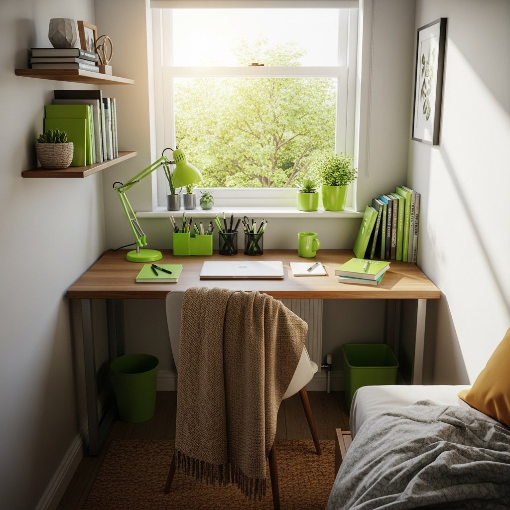 Even in a small room, a compact study corner can be included with the right planning. A small desk placed near a window provides natural light for studying. Use a simple chair and keep the area organized with minimal supplies. Green accents like a desk lamp or organizer tie the space into the overall theme. This creates a functional area without taking up too much space.