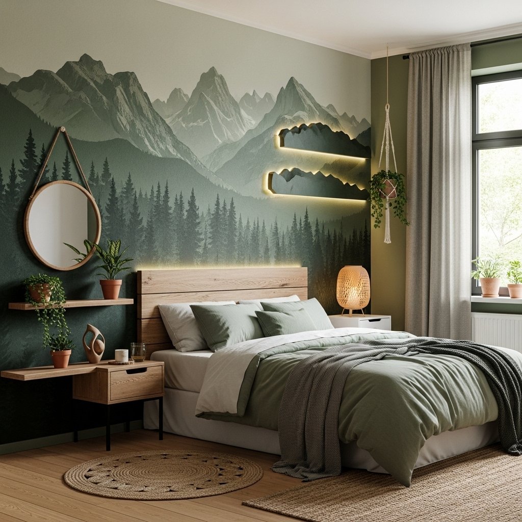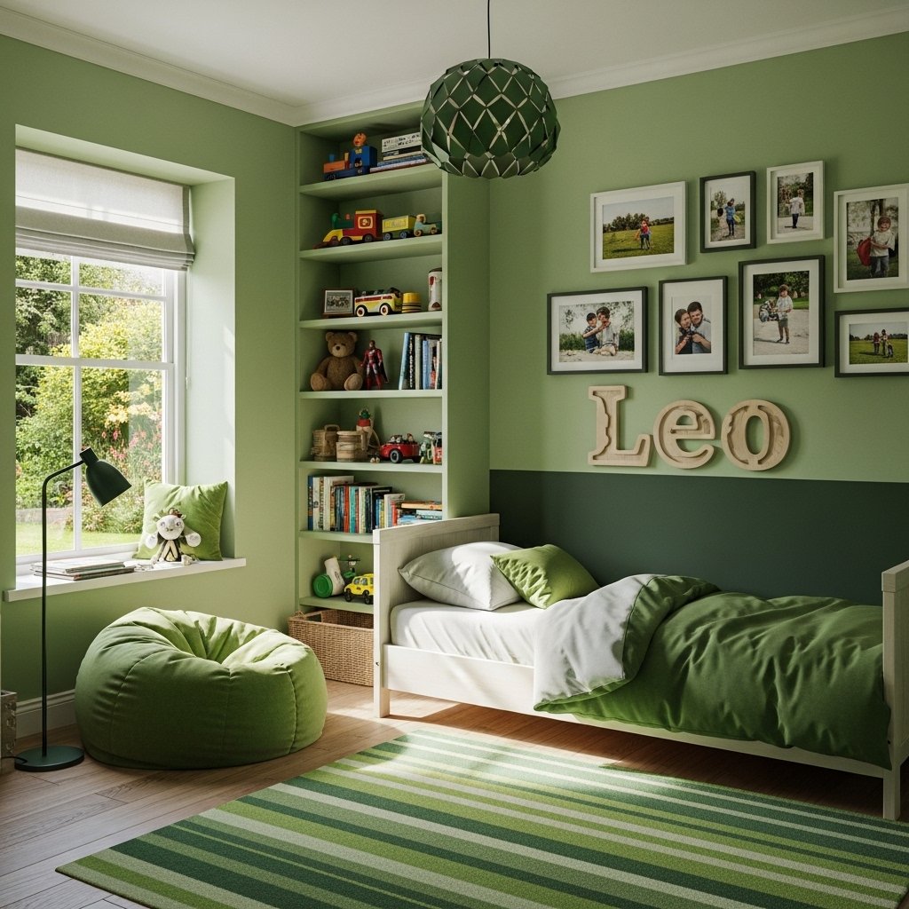 Nature-inspired decor adds personality and warmth to a green-themed bedroom. Wall art featuring forests, mountains, or animals complements the green palette beautifully. Small indoor plants or faux greenery can bring life into the room without taking up much space. Wooden accents and earthy textures further enhance the natural feel. This idea helps create a peaceful and relaxing environment for boys.