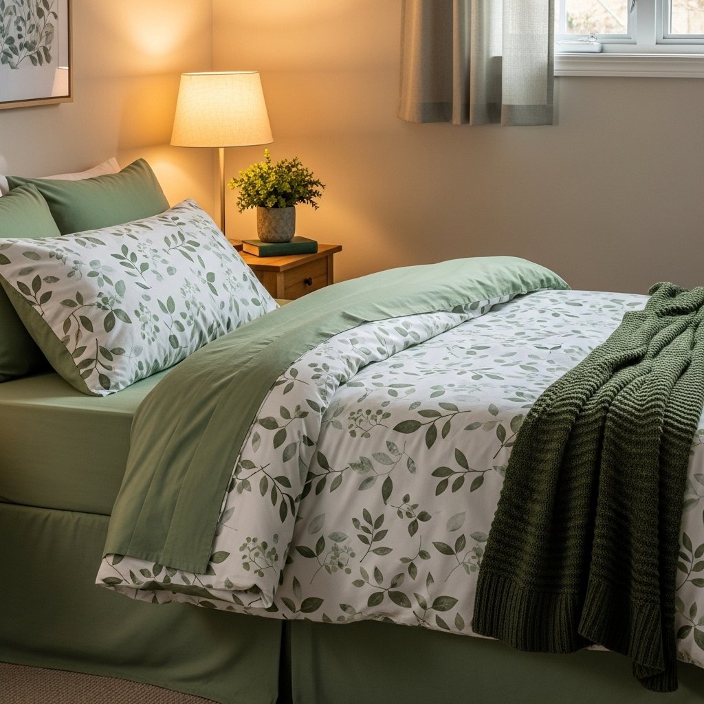 Green-themed bedding is an easy way to bring the color scheme into the room without major changes. Choose comforters, sheets, and pillows in shades of green or with nature-inspired prints. Patterns like leaves, stripes, or simple textures can add depth to the design. Soft fabrics enhance comfort and make the bed the focal point of the room. Coordinated bedding instantly creates a cozy and polished look.