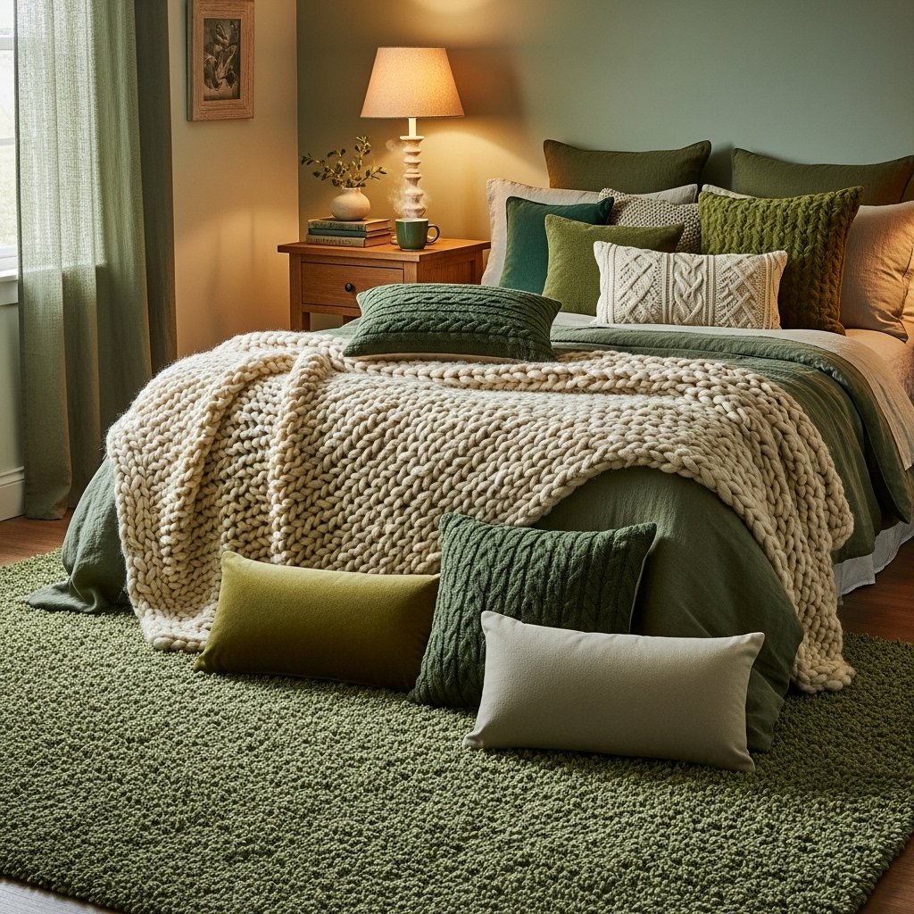 Adding different textures can make a small green bedroom feel more comfortable and layered. Soft rugs, knitted blankets, and plush cushions add warmth and coziness. Mixing materials like wood, cotton, and wool creates a visually appealing design. Textures help break the monotony of a single color palette. This simple trick makes the room feel more inviting and stylish.
