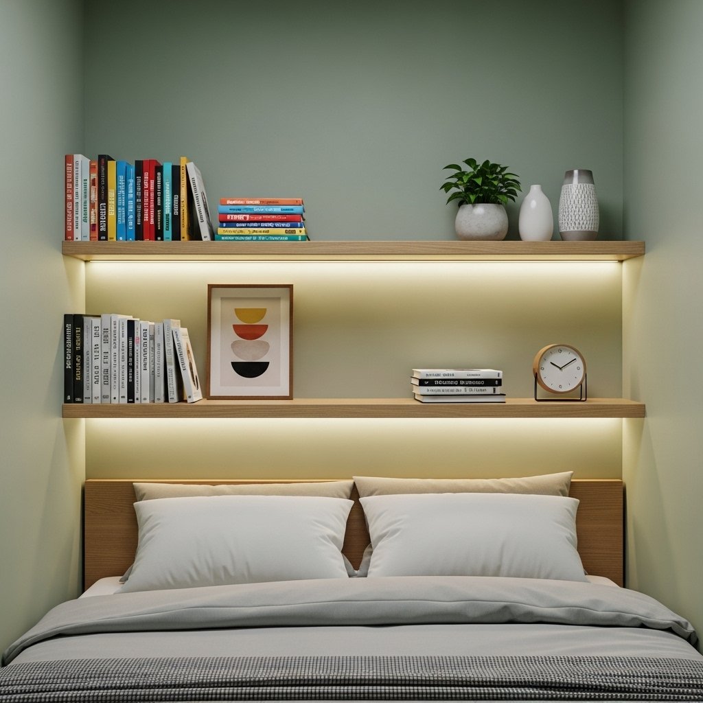 Wall shelves are a smart solution for maximizing storage in a small bedroom. They keep the floor space clear while providing room for books, toys, and decor. Floating shelves in white or wood tones complement green walls beautifully. Arranging items neatly on shelves also adds to the room’s aesthetic appeal. This idea combines practicality with design effortlessly.