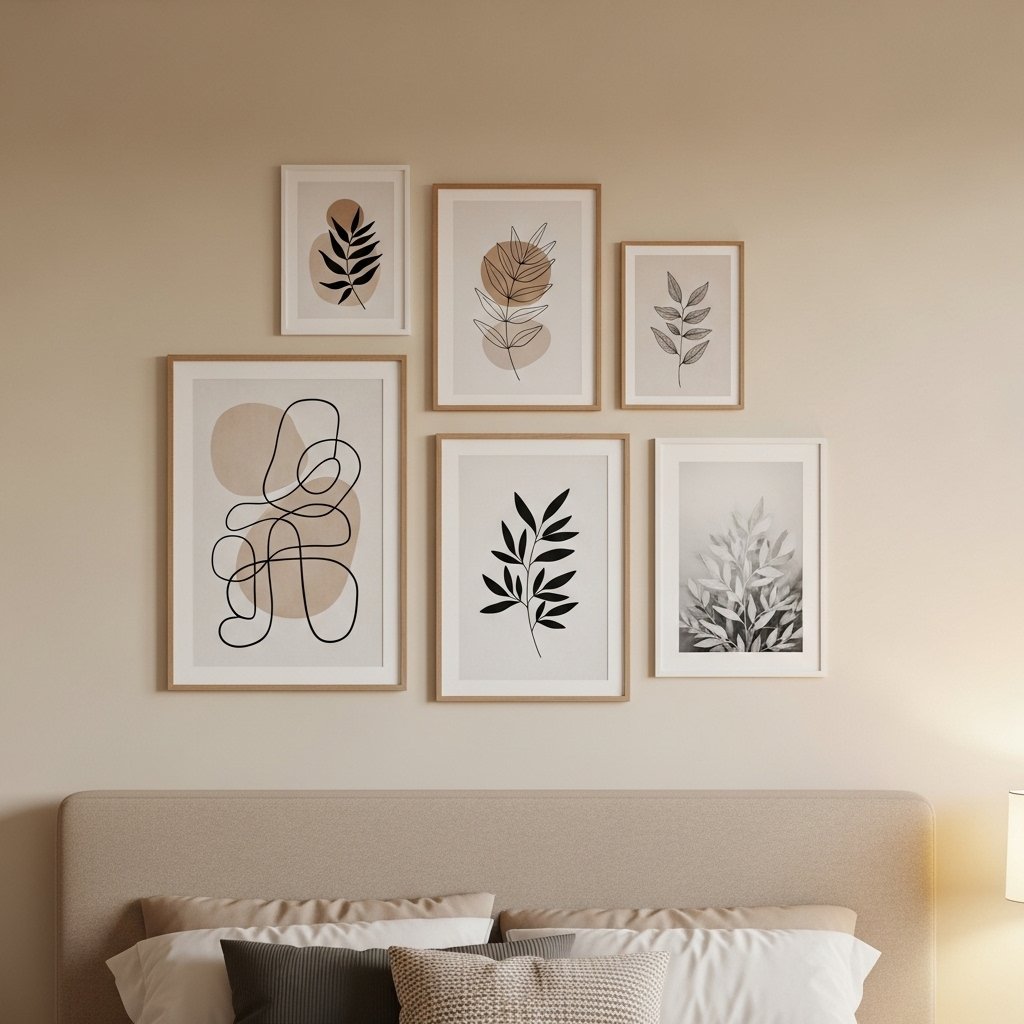 Simple wall art enhances personality without crowding the room. Choose abstract prints, line art, or nature photography in neutral tones. Frames in white, wood, or beige keep the design cohesive. A small gallery wall above the bed adds character without overwhelming the space. This keeps the bedroom visually interesting yet peaceful.