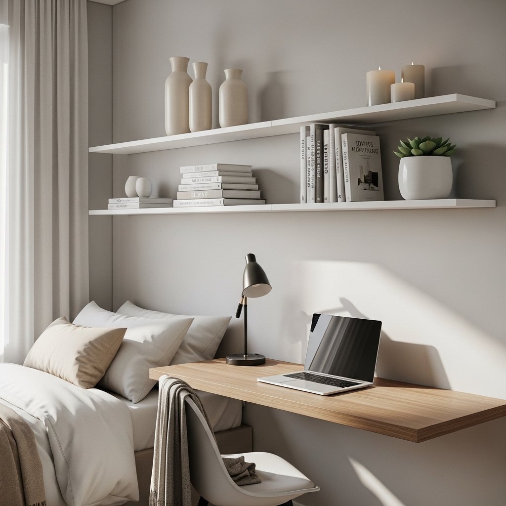 Floating shelves are ideal for small bedrooms because they save floor space. Beige or wooden shelves keep the design cohesive while offering storage for books and decor. Decorate them with neutral items like candles, ceramics, or small plants. Keeping styling minimal avoids visual clutter. This idea merges function and decoration perfectly.