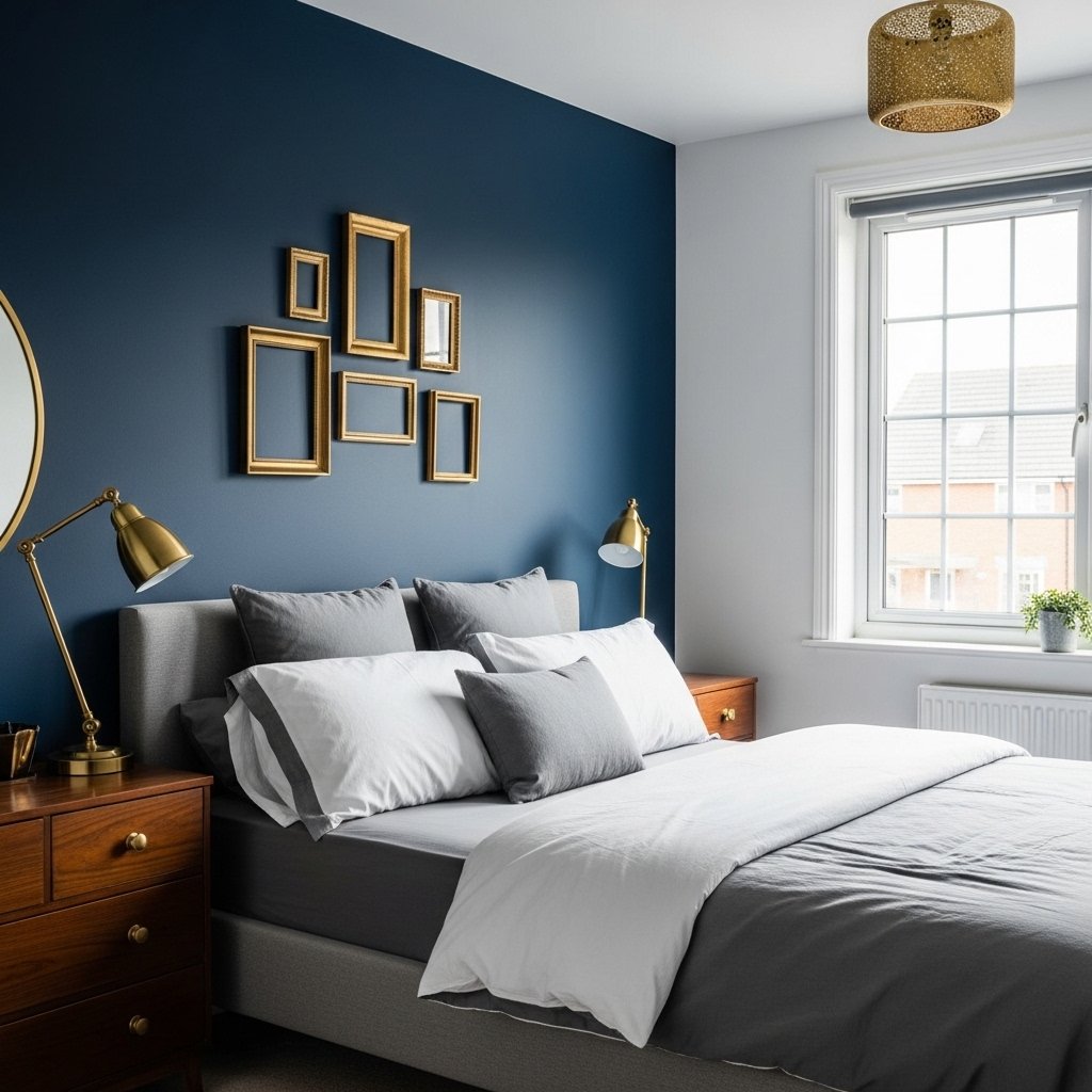 A navy blue accent wall brings depth and elegance to a guest bedroom while maintaining a cozy ambiance. Positioning it behind the bed as a feature wall draws attention and anchors the room visually. Lighter bedding, such as crisp white or soft gray sheets, balances the boldness of navy. Incorporating gold or brass décor accents, like bedside lamps or drawer handles, adds warmth and sophistication. This design works especially well in rooms with ample natural light, creating a rich, inviting feel.