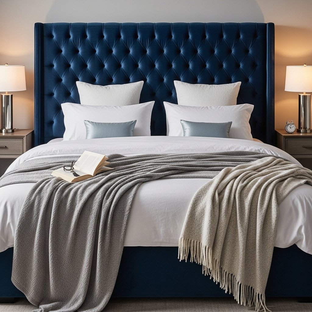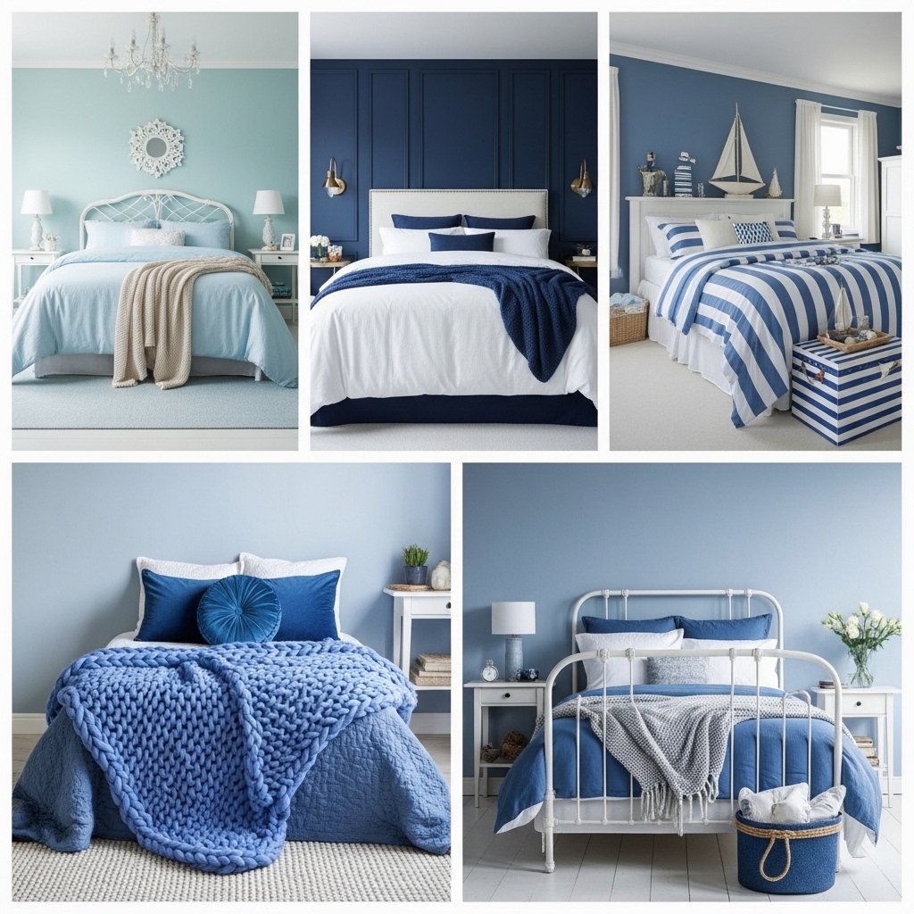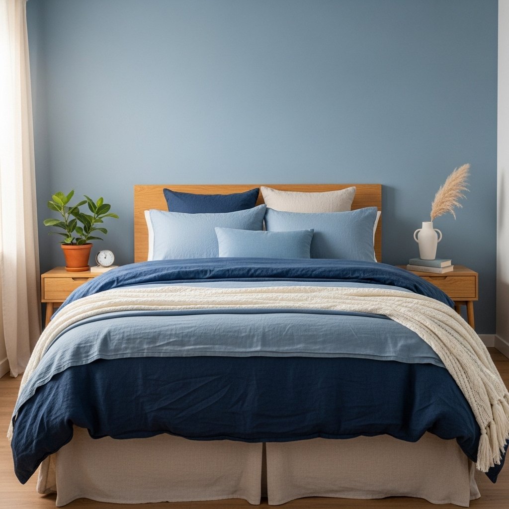 Combining various blue textures adds depth and warmth to a guest bedroom. Think velvet cushions, linen throws, knitted blankets, or satin pillowcases layered over light bedding. The mix of textures creates visual interest and makes the space feel cozy and inviting. Even small touches, like a knitted blue pouf or velvet curtains, contribute significantly to the overall ambiance. Guests will notice the thoughtful layering and feel instantly comfortable in this tactile environment.