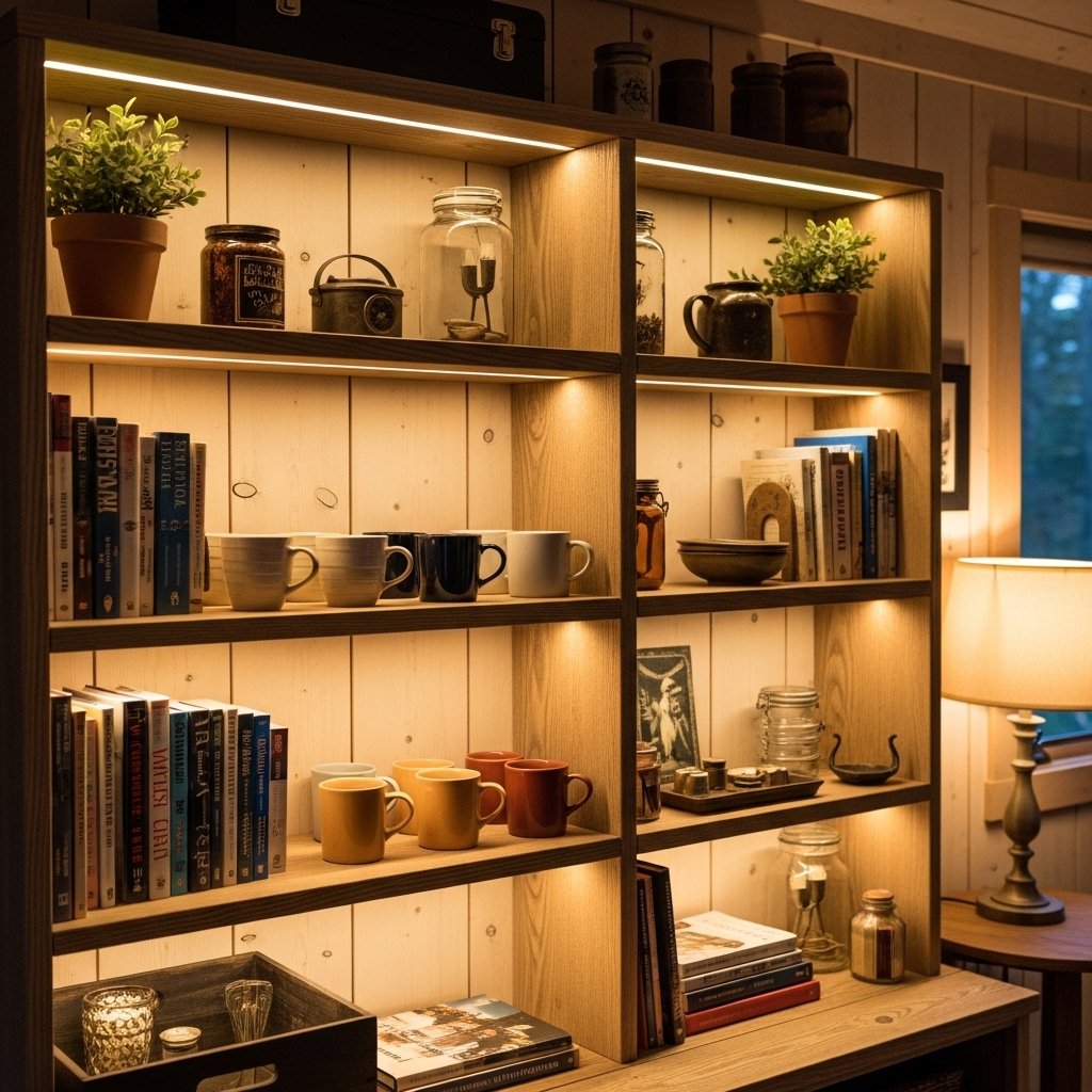 Open shelving is both practical and visually appealing in a cabin setting. Use wooden shelves to display books, mugs, and decorative items. Keep the arrangement simple and uncluttered for a clean look. This approach makes everyday items part of the decor. It also adds warmth and accessibility to the space.