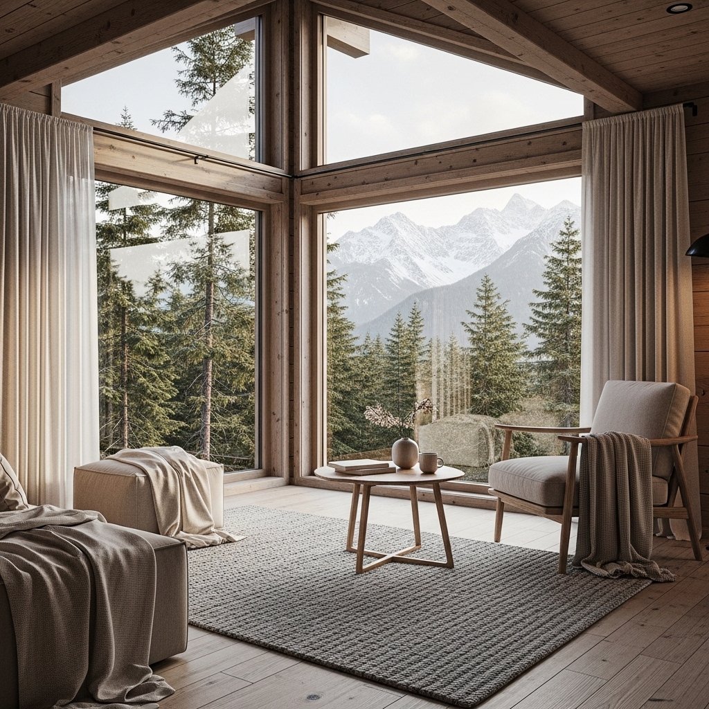 Large windows are essential for connecting the cabin interior with the outdoors. They allow natural light to flood the space and highlight the surrounding scenery. Simple curtains or no curtains at all help maintain an open and airy feel. The view becomes a natural focal point of the room. This design choice enhances both beauty and tranquility.
