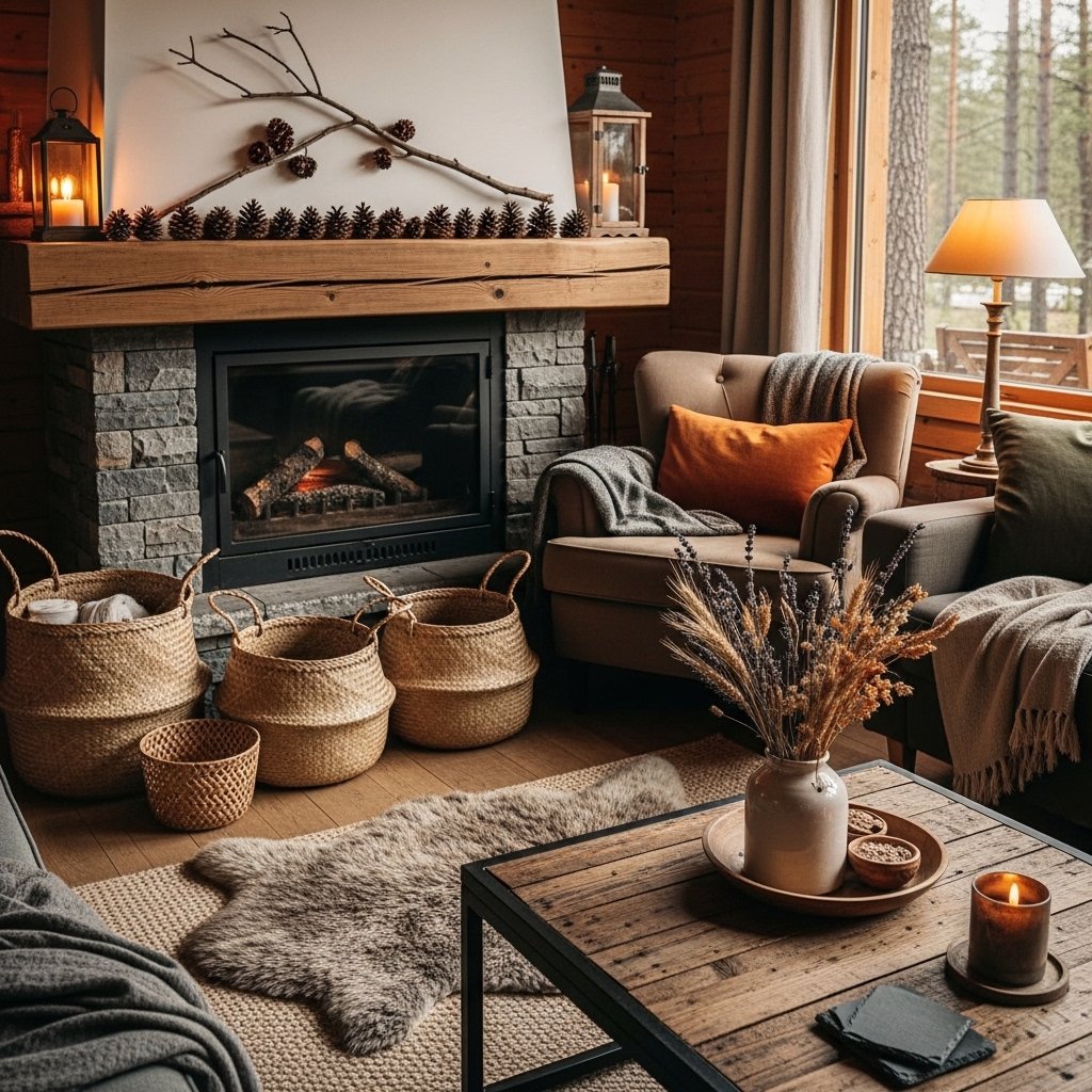 Bringing elements of nature indoors enhances the cabin aesthetic. Decorate with items like pinecones, branches, woven baskets, and dried flowers. Natural materials such as stone, wood, and linen add authenticity to the design. These small details create a connection between the interior and the outdoors. The result is a peaceful and grounded living space.