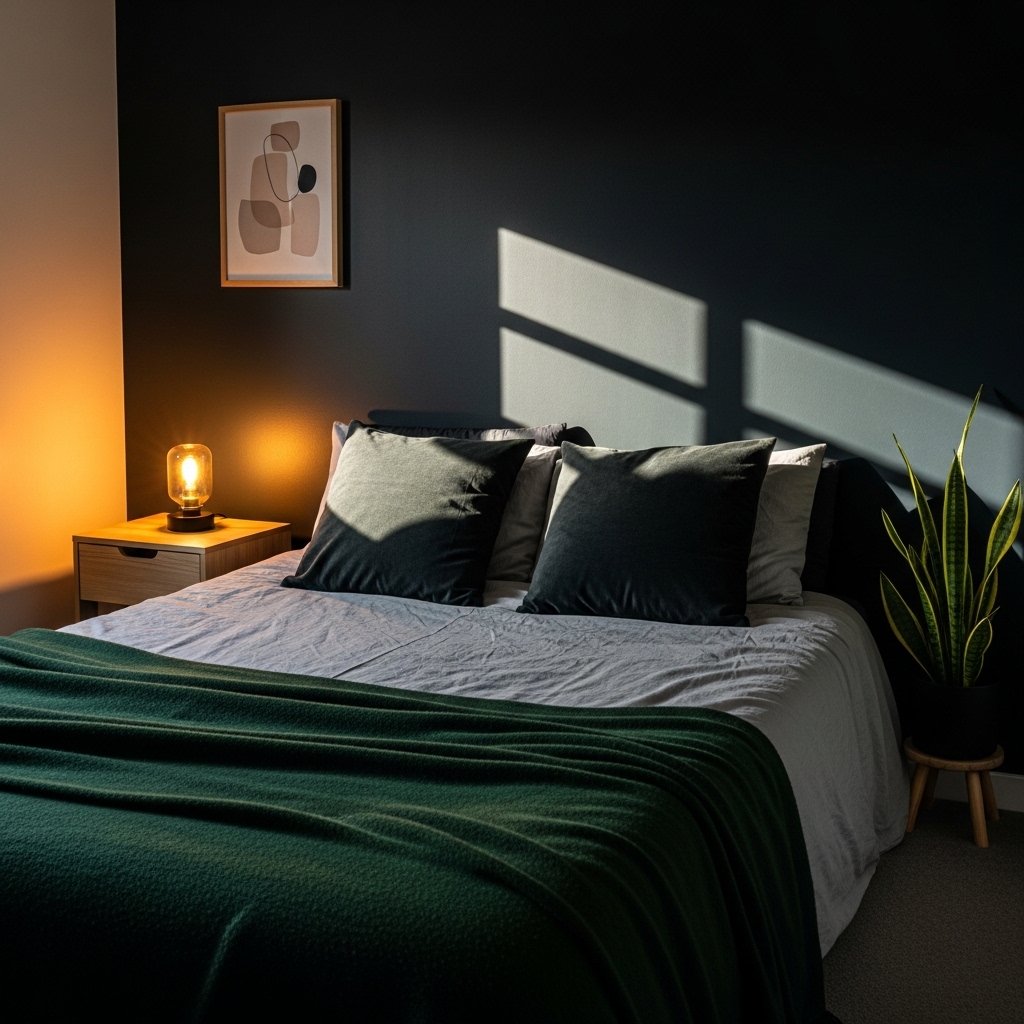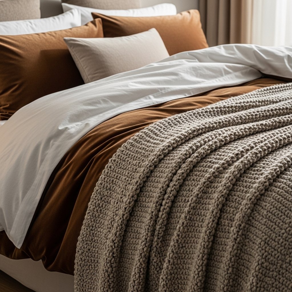 Choose heavy fabrics like velvet, cotton sateen, linen, or knit blankets for the bedding. Deep brown, cream, and muted green tones keep the look cohesive and inviting. Couples appreciate layered bedding because it enhances comfort and warmth during colder nights. Mixing textures prevents the dark palette from appearing flat. The bed becomes a luxurious and restful centerpiece.