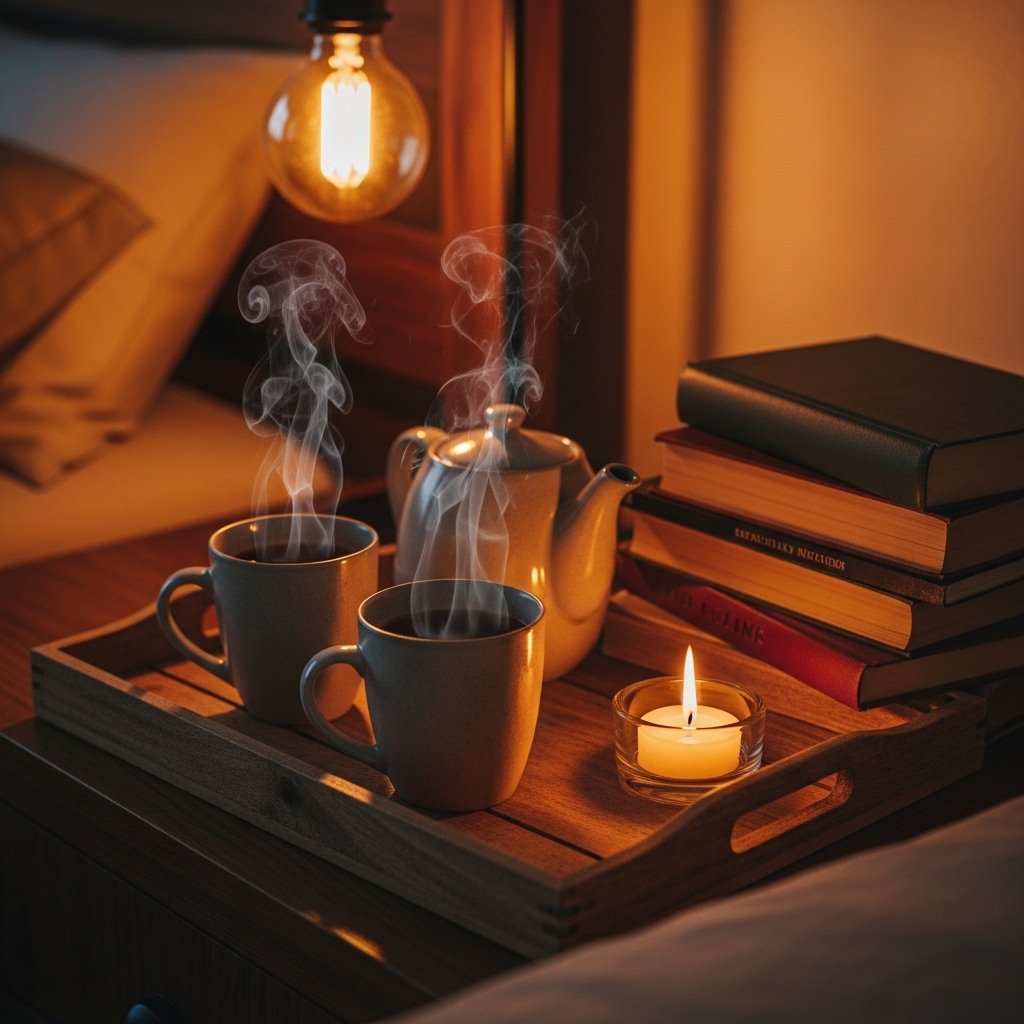 Create a small bedside or corner station for late-night drinks. A wooden tray with mugs, books, and a kettle enhances the cozy couple experience. Sharing tea or coffee before sleep builds relaxing nightly rituals. This idea transforms the bedroom into more than just a sleeping space. It becomes a comforting evening routine area.