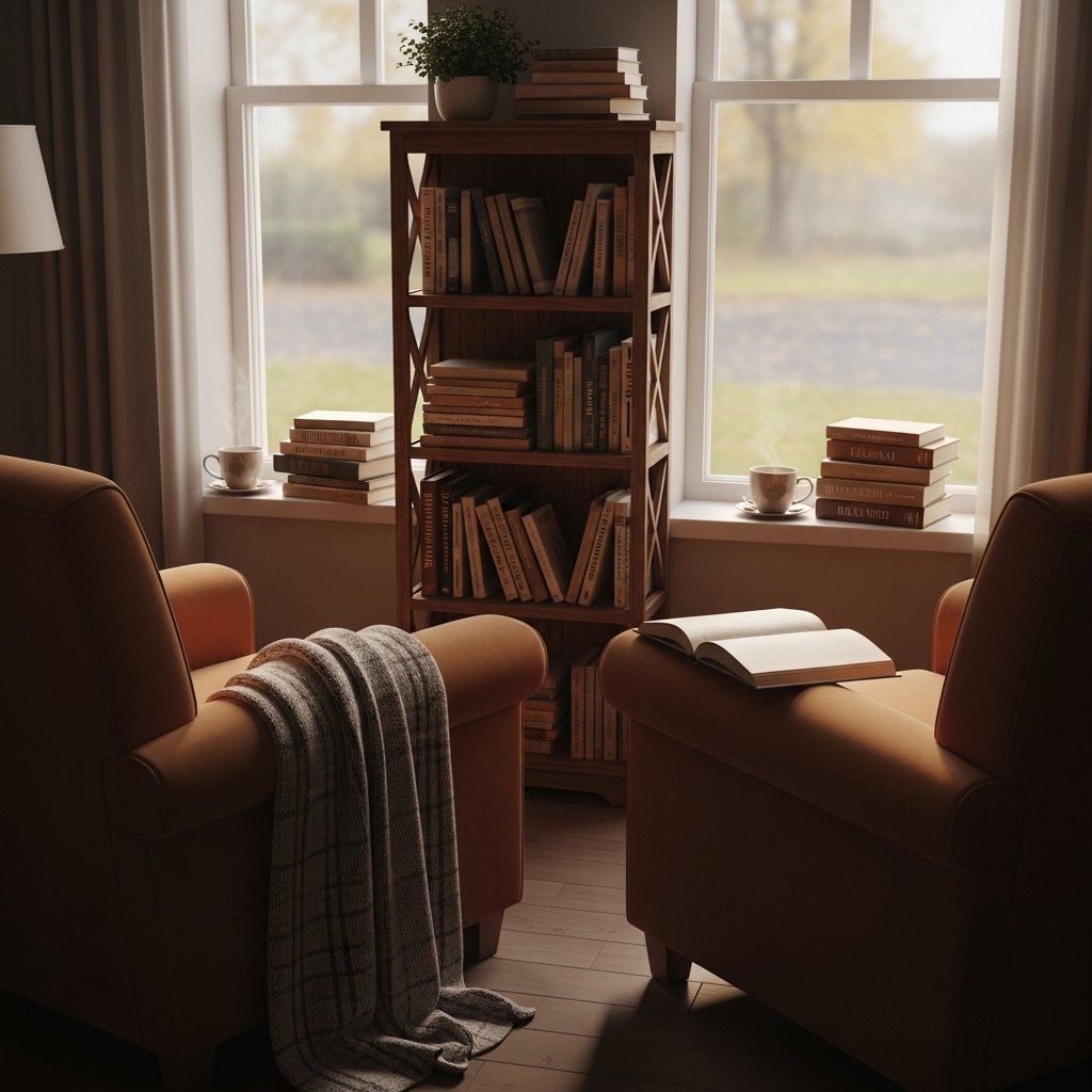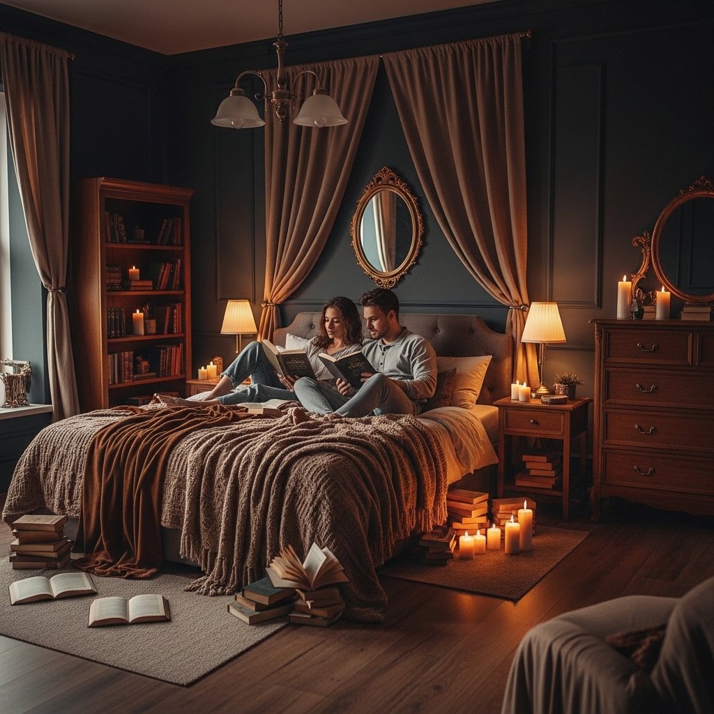 Create a cozy reading corner designed for two people instead of one. Place a loveseat or two armchairs near a small bookshelf or window area. Adding a throw blanket encourages quiet moments together after long days. Couples who read together naturally spend more meaningful time in the bedroom. This space reinforces the intellectual heart of dark academia style.
