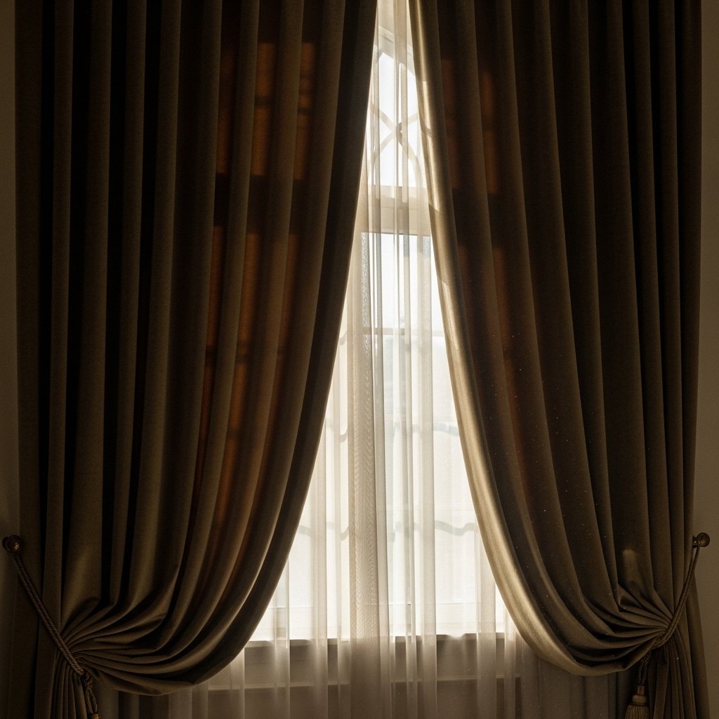Heavy curtains dramatically transform the mood of a bedroom. Choose thick fabrics in deep tones like olive, brown, or dark beige. Curtains help control lighting and increase privacy for couples. When slightly open, they allow soft natural light to filter into the room beautifully. They also enhance the old-world academic atmosphere.