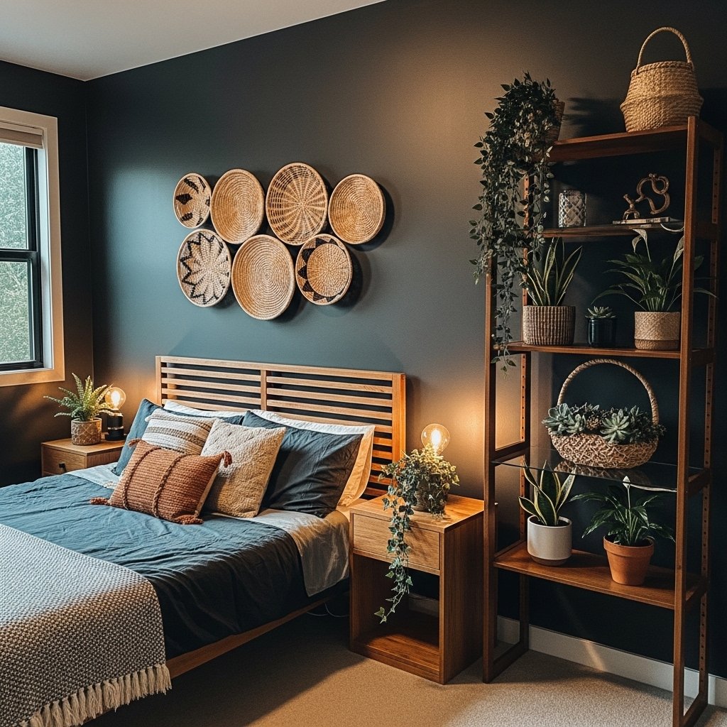 Natural elements like wooden furniture, woven baskets, or indoor plants soften dark bedrooms and add life. Wood tones contrast beautifully against dark walls, creating warmth and grounding the space. Indoor plants add freshness and help purify the air while adding texture. Small vases, planters, or hanging greenery can be used without taking up much room. Bringing nature indoors makes a dark small bedroom feel more inviting and alive.