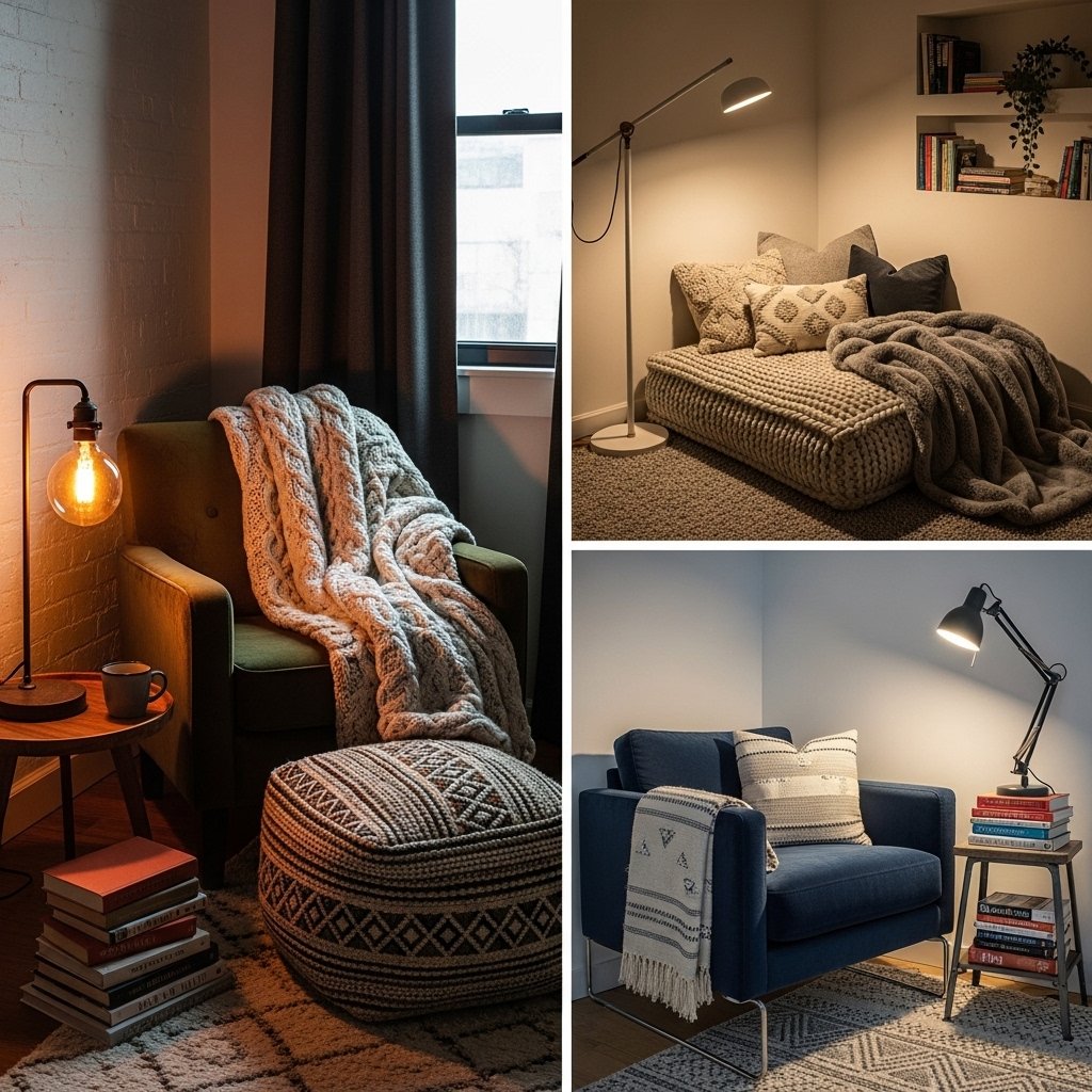Even in small dark bedrooms, creating a cozy reading nook adds comfort and personality. A small armchair, pouf, or floor cushion with a soft throw and lamp can transform a corner into a relaxing spot. Add a small shelf or stack of books nearby for convenience. This feature not only makes the room functional but enhances its cozy atmosphere. Reading nooks invite you to unwind and make the space feel lived-in.