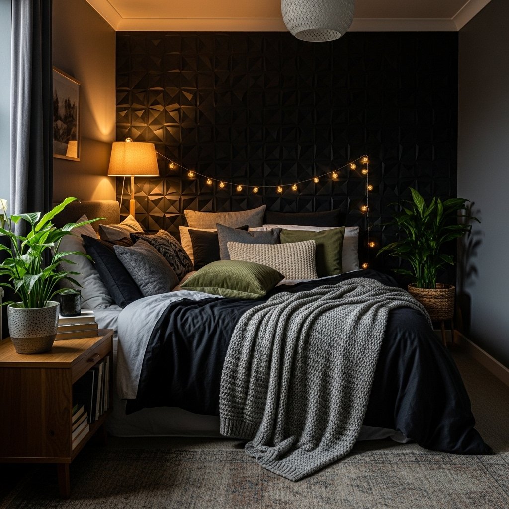 You can make a small dark bedroom feel cozy by adding soft lighting such as bedside lamps, warm LED lights, or fairy lights. Layering different textures like velvet cushions, knit throws, and soft rugs also adds warmth. Keeping the layout simple and clutter-free helps maintain comfort while allowing the dark tones to create a calm and intimate feeling.