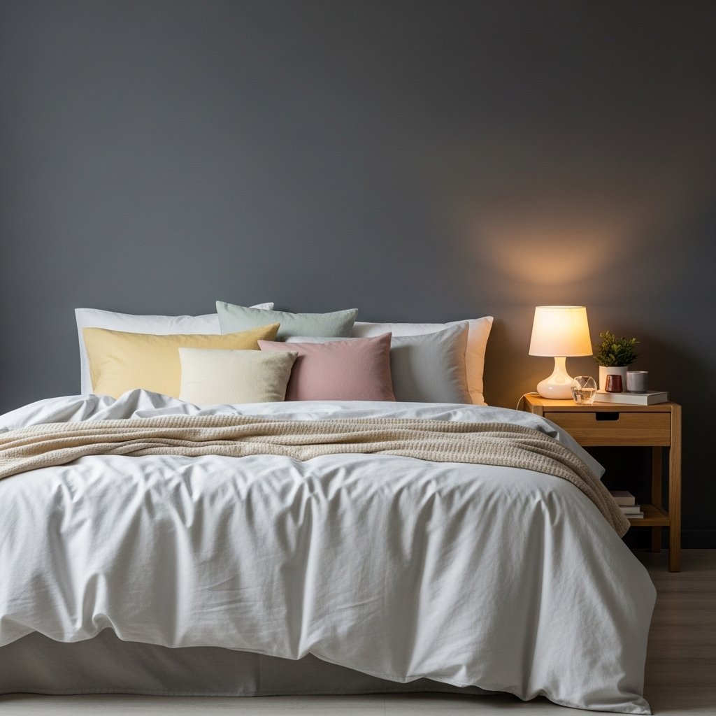 Using light-colored bedding in a dark grey bedroom balances the room’s deep tones. White, cream, or soft beige sheets and comforters contrast beautifully with dark grey walls. This contrast opens up the space visually and enhances the cozy vibe. Adding accent pillows in muted shades of yellow or pink can further brighten the look without overpowering the grey. This combination creates a soothing, inviting atmosphere perfect for rest and relaxation.