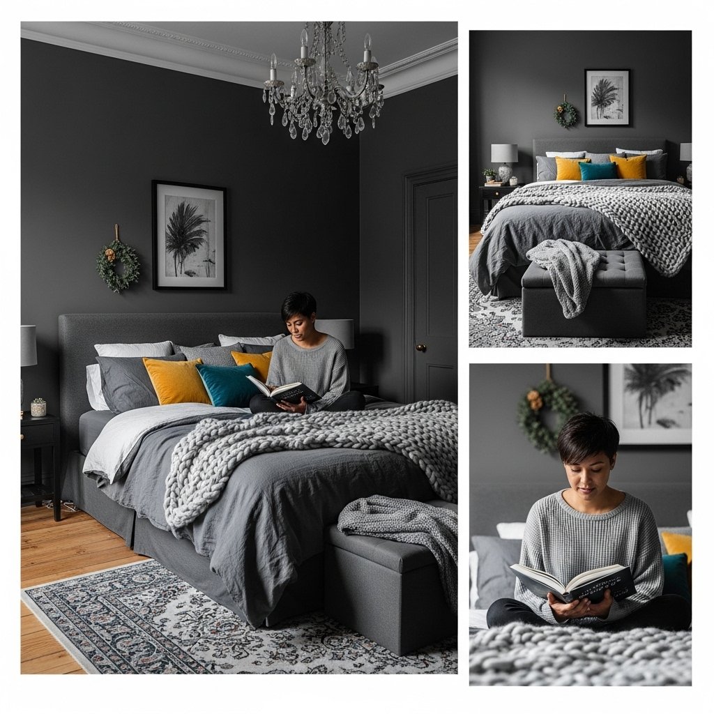 Adding a small reading nook elevates the comfort of a dark grey bedroom. A corner with a soft armchair, a throw blanket, and a side table creates a personal retreat. Choose a light-colored chair or cushion to contrast with the dark walls. This cozy corner is ideal for relaxing, reading, or enjoying a cup of coffee. Small details like a floor lamp or decorative rug complete the inviting atmosphere.