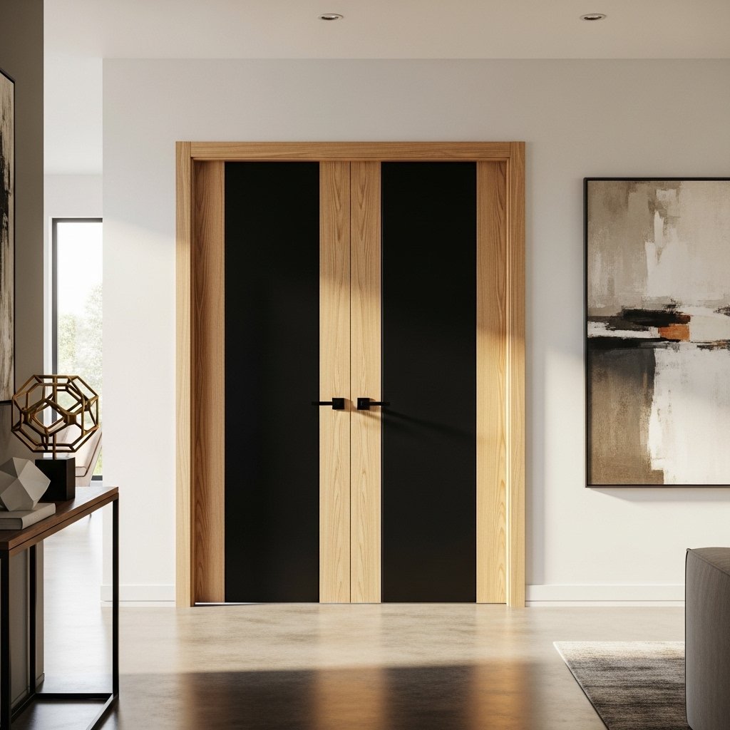 Two-tone doors combine dark shades with lighter elements for a unique design effect. For example, black paired with wood or white creates a striking visual balance. This style adds creativity and personality to interior spaces. It works well in contemporary homes that focus on artistic design elements. Two-tone doors are ideal for making a subtle yet stylish statement.