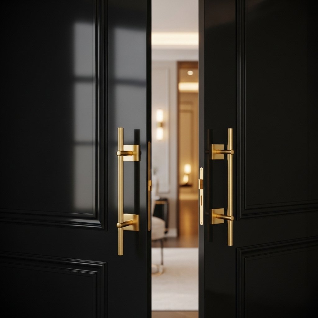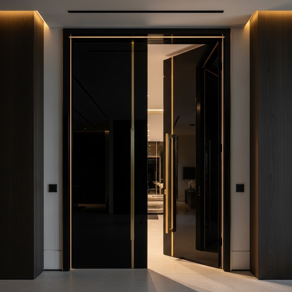 High gloss black doors add a reflective, polished surface that instantly elevates any room. The shiny finish enhances lighting and creates a premium look. These doors are often used in luxury apartments and modern homes. They pair well with metallic accents like chrome or gold. This style is perfect for those who want a dramatic and high-end interior statement.