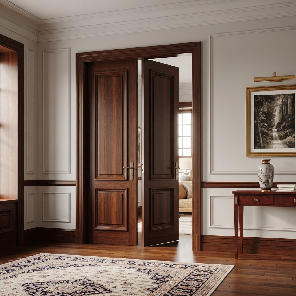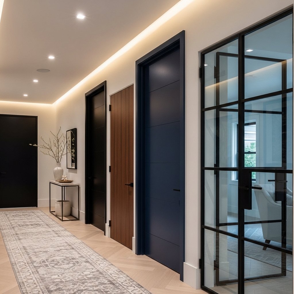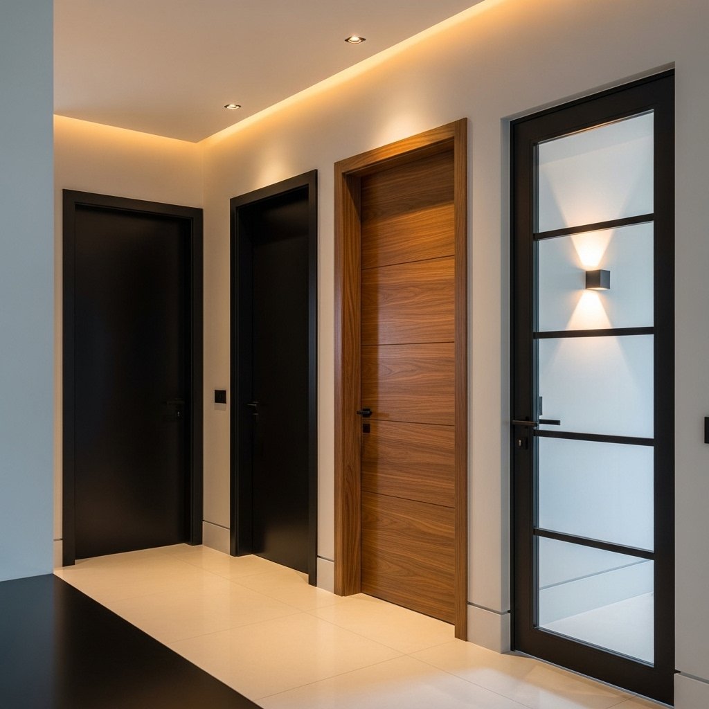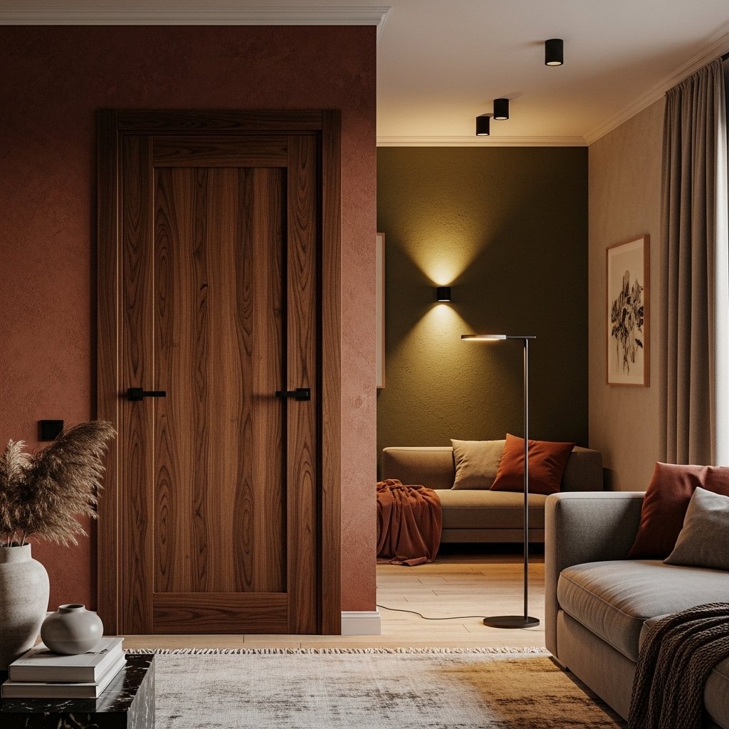 Dark walnut wood doors bring warmth and richness to interior spaces while maintaining a sophisticated look. The natural wood grain adds texture and depth, making each door unique. This option works beautifully in both modern and traditional homes. When combined with soft lighting, walnut doors create a cozy and inviting atmosphere. They are ideal for homeowners who want a natural yet luxurious dark doors interior style.