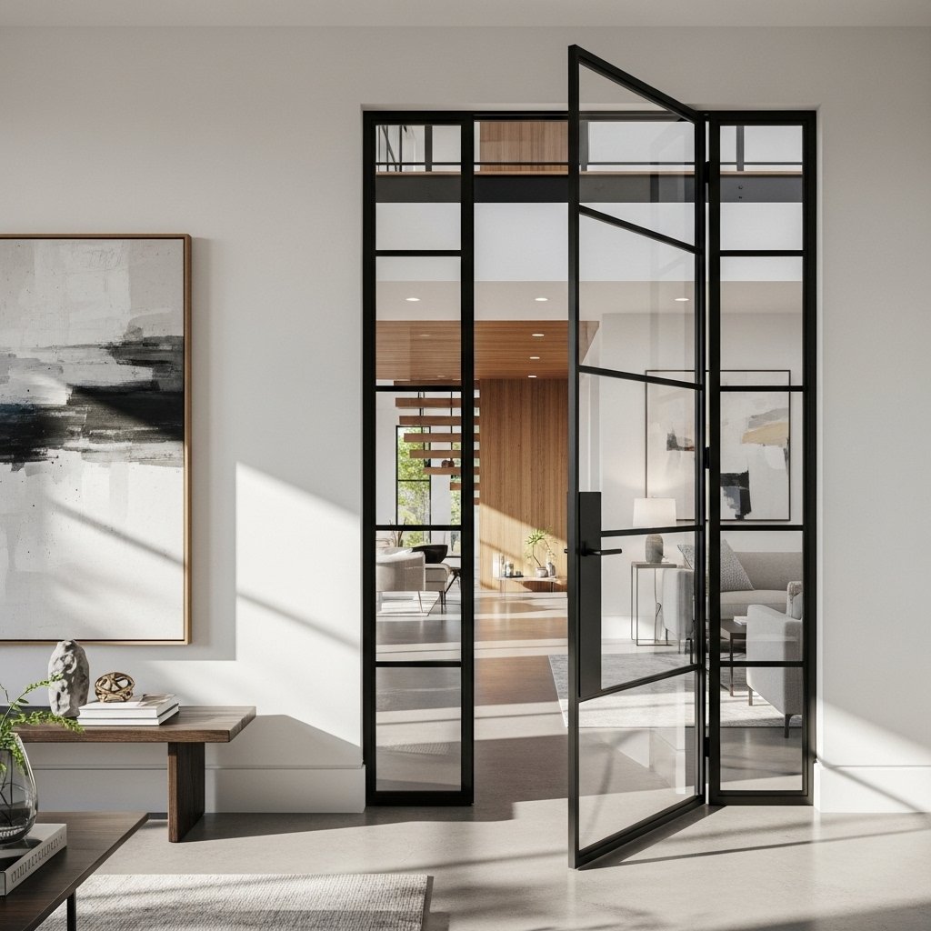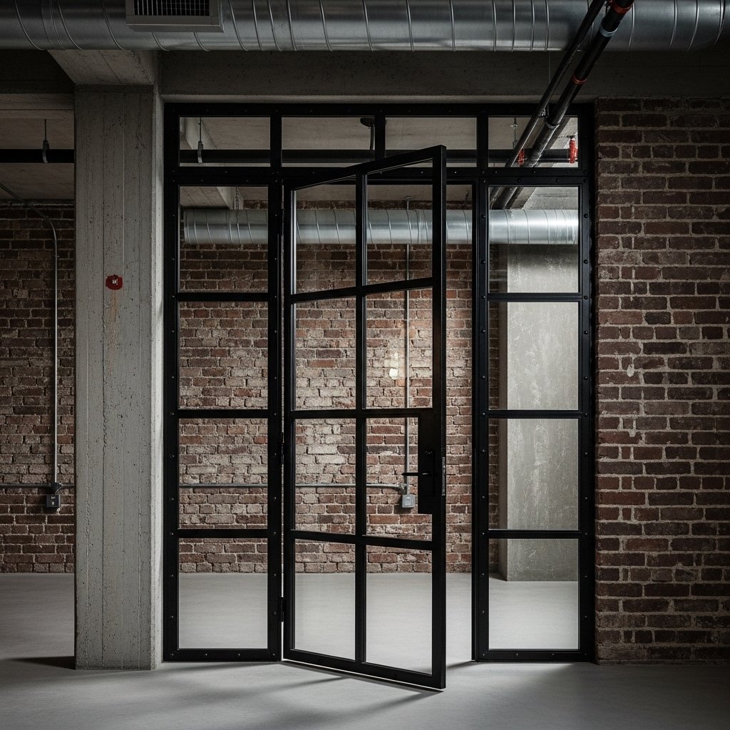 Industrial-style dark metal doors bring a strong and edgy look to any interior space. These doors often feature black steel frames and simple geometric designs. They are commonly used in loft apartments and modern urban homes. The rugged finish pairs well with exposed brick, concrete walls, and raw textures. This design is ideal for homeowners who prefer a bold and contemporary aesthetic.