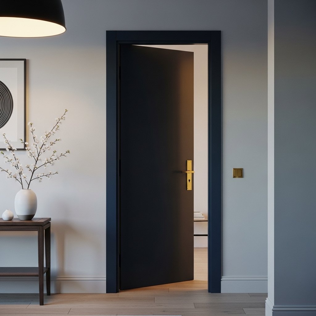 Dark navy doors offer a unique alternative to traditional black or brown options. This color adds depth while still feeling soft and sophisticated. Navy pairs beautifully with gold or brass hardware for a luxurious finish. It works well in coastal, modern, or classic interior themes. This dark doors interior idea is perfect for those who want color with subtle boldness.