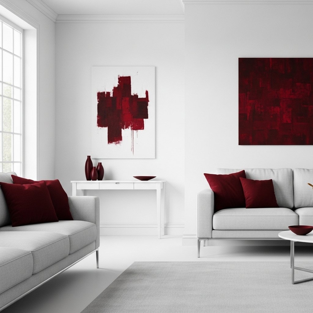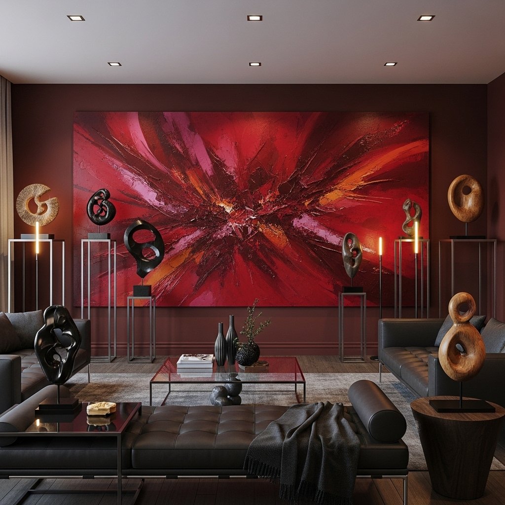 Using dark red in artistic decor pieces allows for creative and flexible interior styling. Paintings, sculptures, and wall art in red tones can enhance the overall mood of a room. This approach lets you experiment without committing to permanent changes. It works well in both modern and traditional homes. This idea is perfect for adding personality and artistic expression to your space.