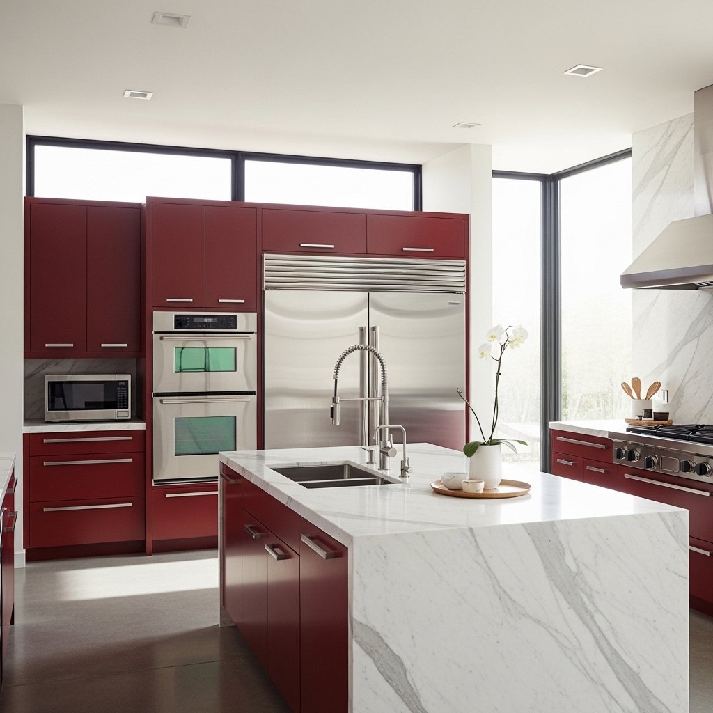 Incorporating dark red into kitchen cabinets creates a unique and modern cooking space. Wine red cabinets paired with white or marble countertops look especially elegant and clean. This color adds warmth to the kitchen, making it feel more welcoming and stylish. Stainless steel appliances also complement the deep tones beautifully. This idea is perfect for homeowners who want a bold yet functional kitchen design.
