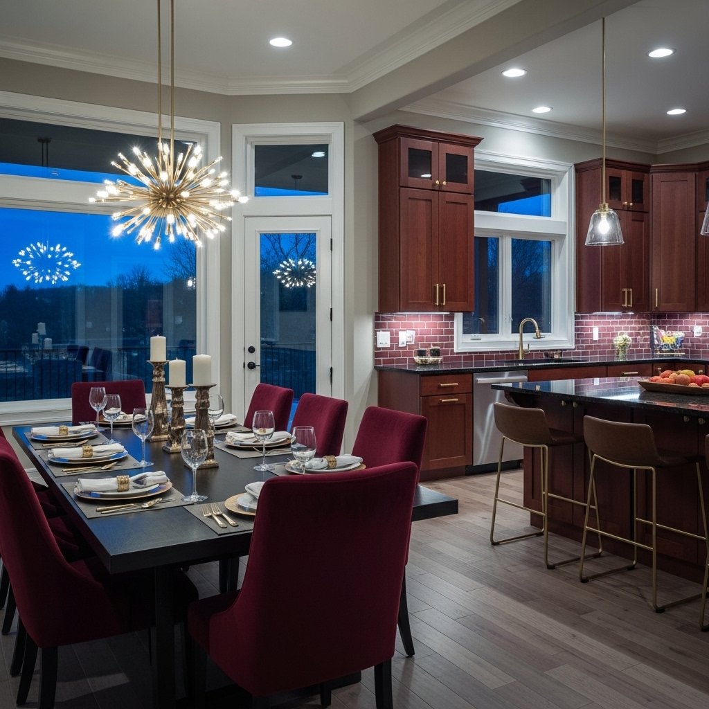 A dark red dining room creates a warm and inviting atmosphere for family meals and gatherings. You can introduce this color through chairs, table runners, or wall paint. It encourages a sense of comfort and luxury during dining experiences. Gold or wooden accents enhance the richness of the design. This idea is ideal for creating a memorable and stylish dining space.