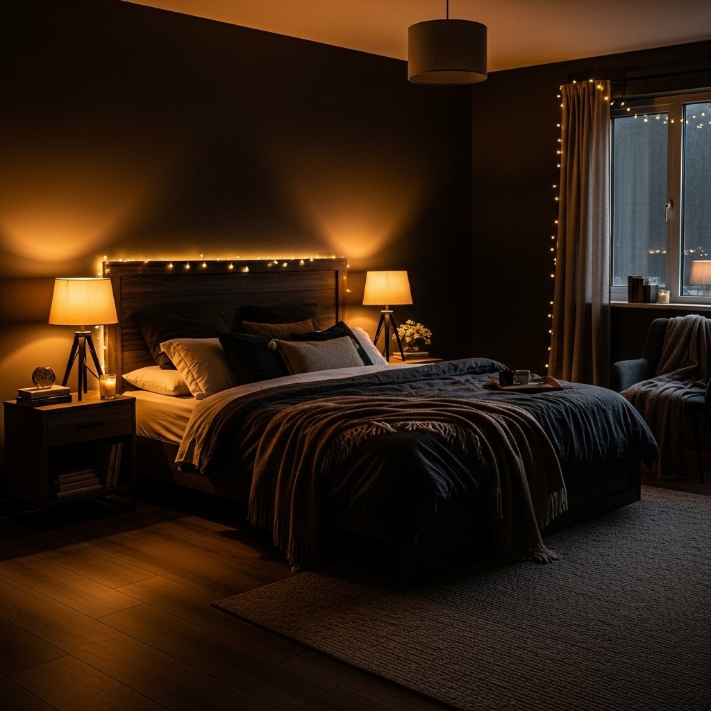 Lighting is essential in a dark bedroom to prevent it from feeling too heavy or gloomy. Combine ambient lighting, task lighting, and accent lights for a balanced effect. Warm LED bulbs, bedside lamps, and string lights create a cozy, intimate atmosphere. Using dimmers allows you to adjust the mood according to the time of day. Proper lighting ensures the room feels inviting without compromising its dark, moody aesthetic.