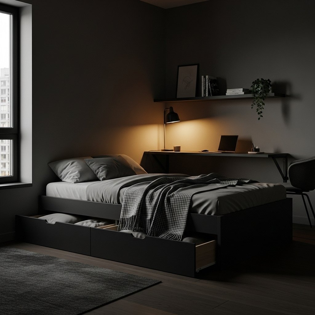 Dark rooms can feel smaller if clutter is present, so maintaining an organized space is key. Use smart storage solutions like under-bed drawers, shelves, and cabinets to keep surfaces clear. Minimal furniture and décor prevent the room from feeling heavy or overwhelming. A tidy layout ensures the dark, cozy elements shine without creating a cramped feeling. Organization is essential for making a dark bedroom feel relaxing and inviting.