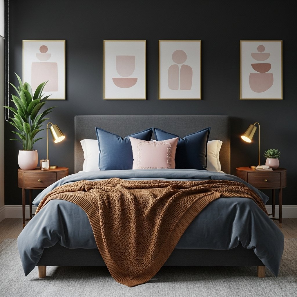 Deep wall colors like navy, charcoal, or forest green give the bedroom sophistication and elegance. Pair dark walls with warm accent colors like blush, gold, or caramel to avoid feeling too heavy. Accessories such as pillows, throws, or small décor items in lighter or metallic tones add dimension. This combination creates a luxurious, cozy, and balanced atmosphere. Dark walls can also make other design elements, like artwork or bedding, stand out beautifully.