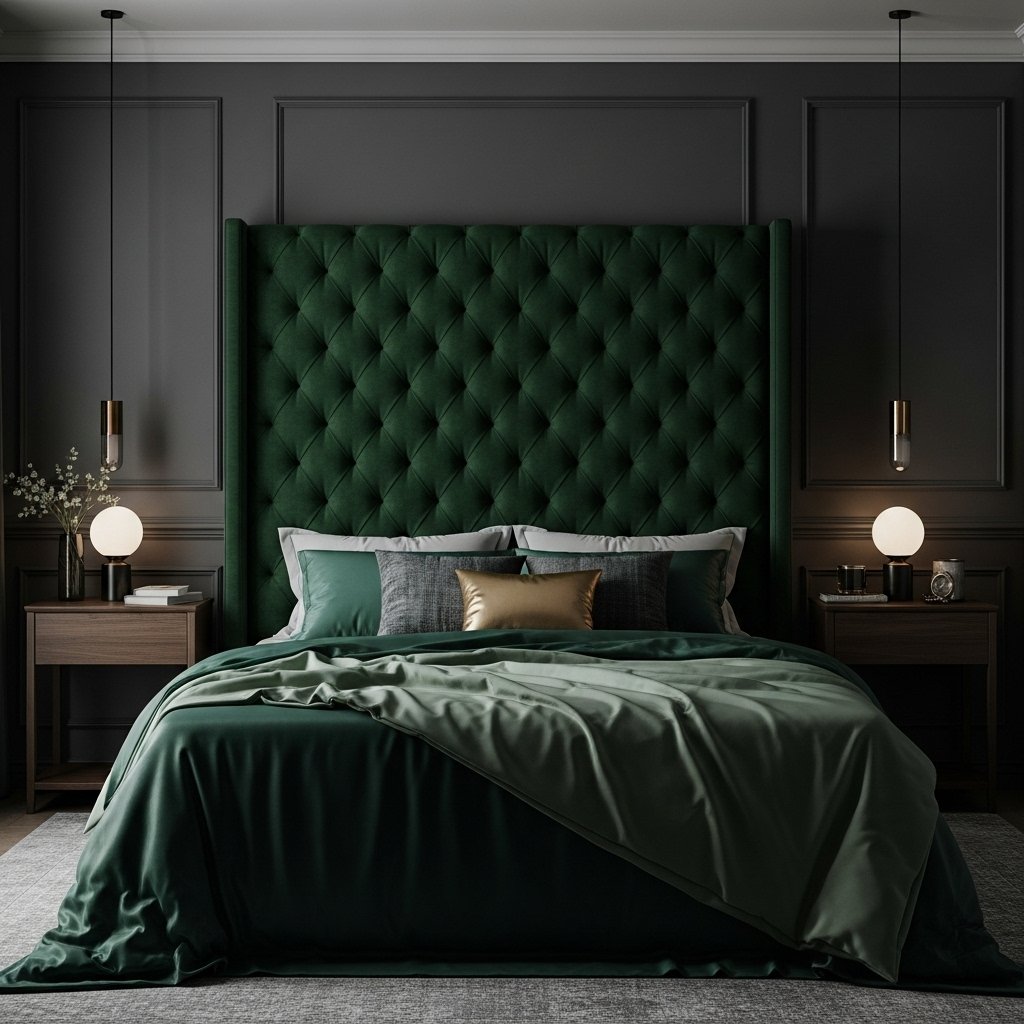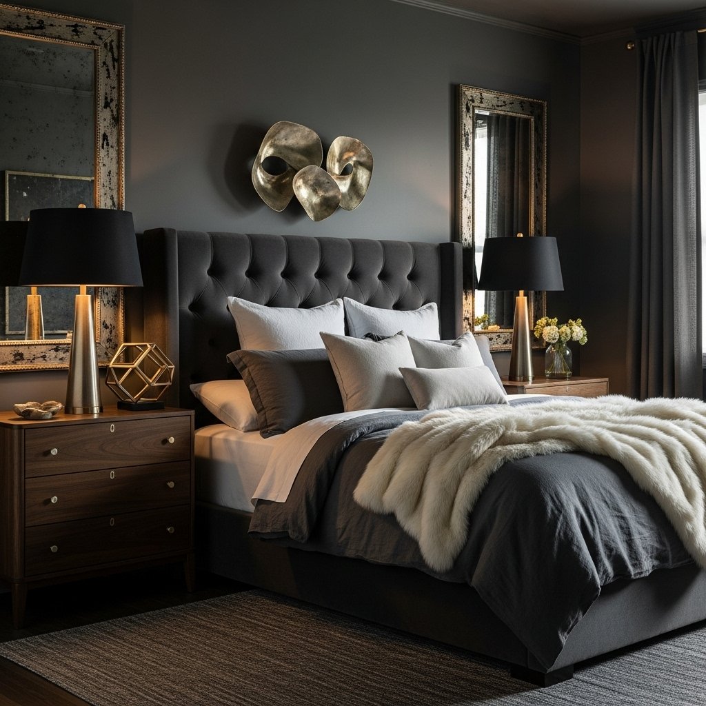 A bold headboard or furniture piece becomes the focal point in a dark bedroom. Velvet, tufted, or wooden headboards add texture and luxury. A unique dresser, nightstand, or accent chair can bring personality to the space. Choose pieces that complement the dark walls without overpowering the room. Statement furniture adds style and coziness while anchoring the design.