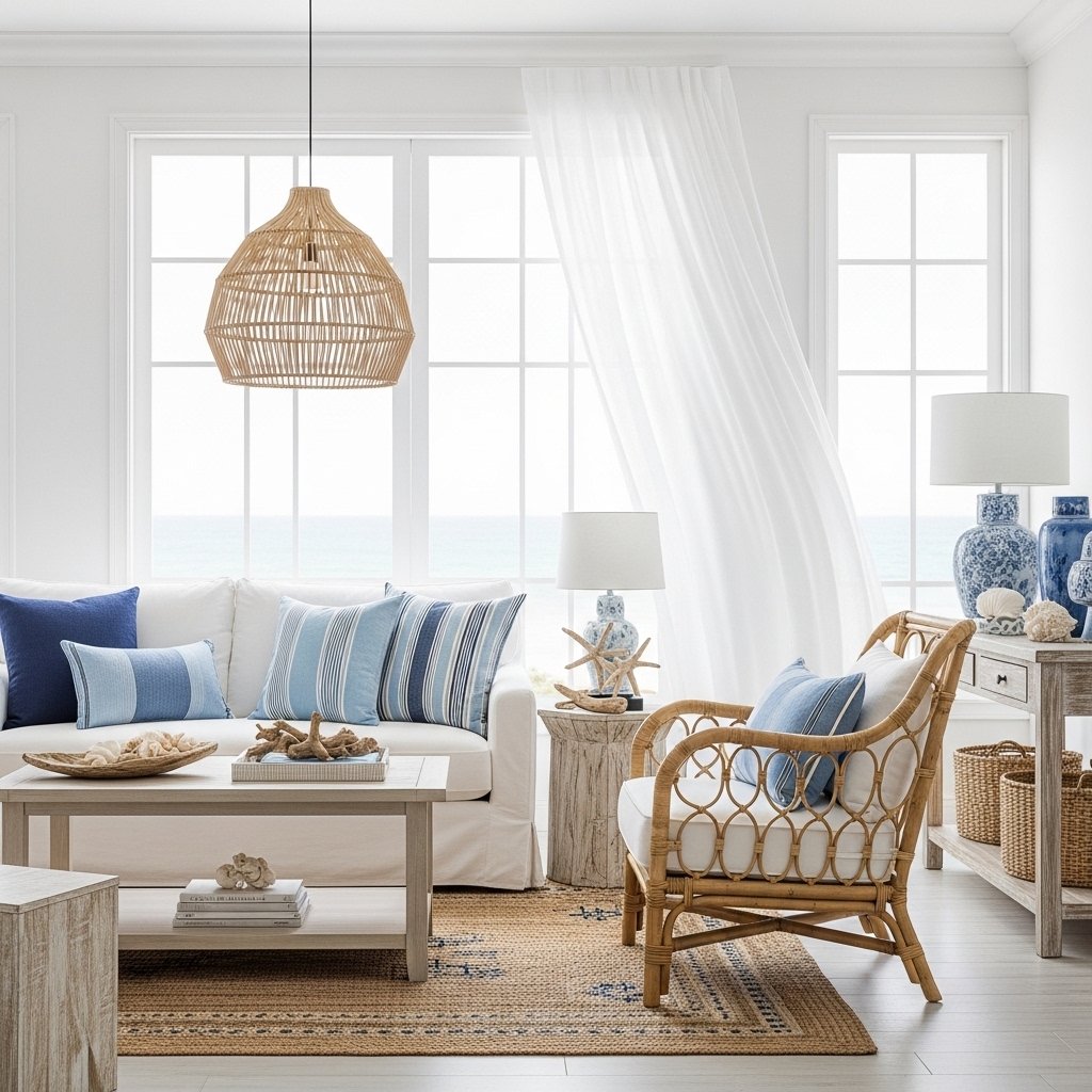 Coastal interiors are inspired by the beach, creating a light and breezy atmosphere. Soft colors like white, blue, and sandy beige dominate the palette. Natural materials such as rattan, linen, and wood enhance the relaxed vibe. Large windows and open spaces allow natural light to flow freely. This style is perfect for creating a calm and refreshing environment.