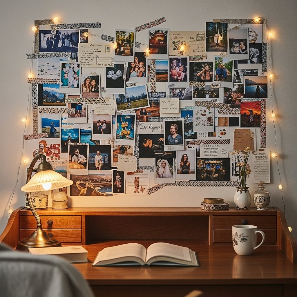A photo collage wall is a personal and nostalgic way to decorate your room. Collect your favorite photos, postcards, or printed memories and arrange them creatively on a wall using frames, string lights, or washi tape. This DIY idea adds warmth and personality while keeping the room vibrant. You can mix black-and-white photos with colorful prints for contrast. It’s also a flexible design that can be updated as you capture new memories.