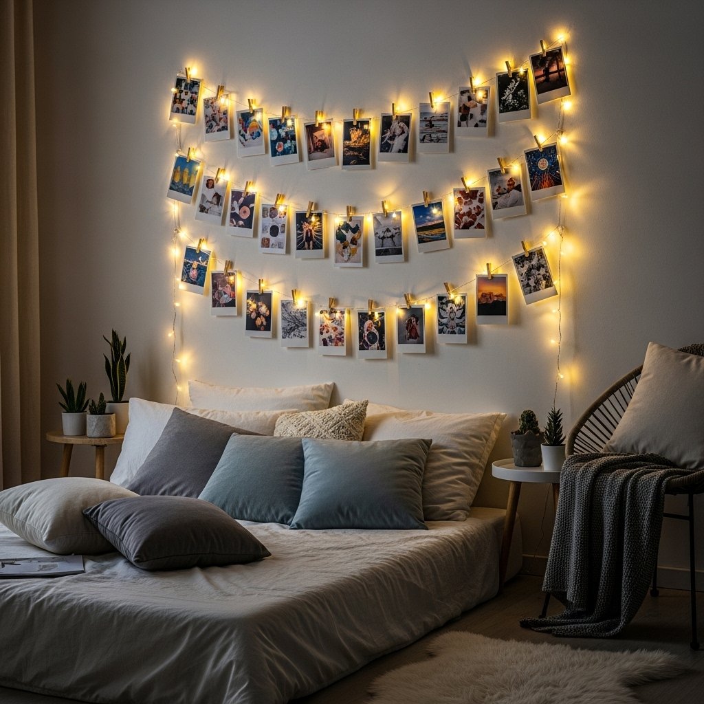 Using string lights with clipped photos or prints is a creative and cozy wall decor idea. The soft glow of the lights adds warmth while highlighting your favorite memories or art pieces. You can hang the lights in straight lines, grids, or cascading patterns to fit your room layout. This DIY aesthetic is especially popular for teen rooms, dorms, or casual living spaces. It’s inexpensive, customizable, and instantly adds a magical ambiance.