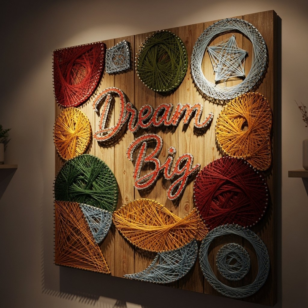 String art combines nails, wood, and thread to form creative shapes, words, or patterns on your walls. It’s a tactile and eye-catching project that suits both minimalist and boho aesthetics. You can make your initials, inspirational quotes, or geometric designs easily. String art is durable, reusable, and adds a 3D element to your room. It’s perfect for feature walls or smaller accents over desks or beds.