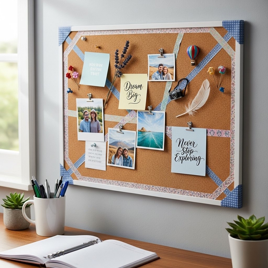 A DIY corkboard or memo board keeps your room organized and visually appealing. Use a cork sheet or pinboard and decorate it with washi tape, small photos, or inspirational quotes. This functional decor adds personality while keeping reminders, notes, or photos easily accessible. It’s perfect for study spaces, work-from-home setups, or bedrooms. Personalized boards add structure and charm to a cozy aesthetic.