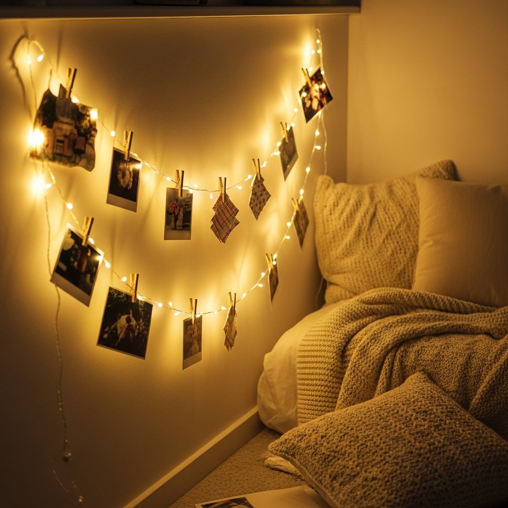 Fairy lights instantly make any room feel magical and cozy. You can drape them along walls, around windows, or across a headboard to create soft ambient lighting. For a creative touch, hang photos, postcards, or fabric pieces along the lights for a personalized gallery effect. This simple DIY is budget-friendly and works in bedrooms, study areas, or even living rooms. Fairy lights create a warm, aesthetic vibe perfect for relaxing evenings or casual socializing.