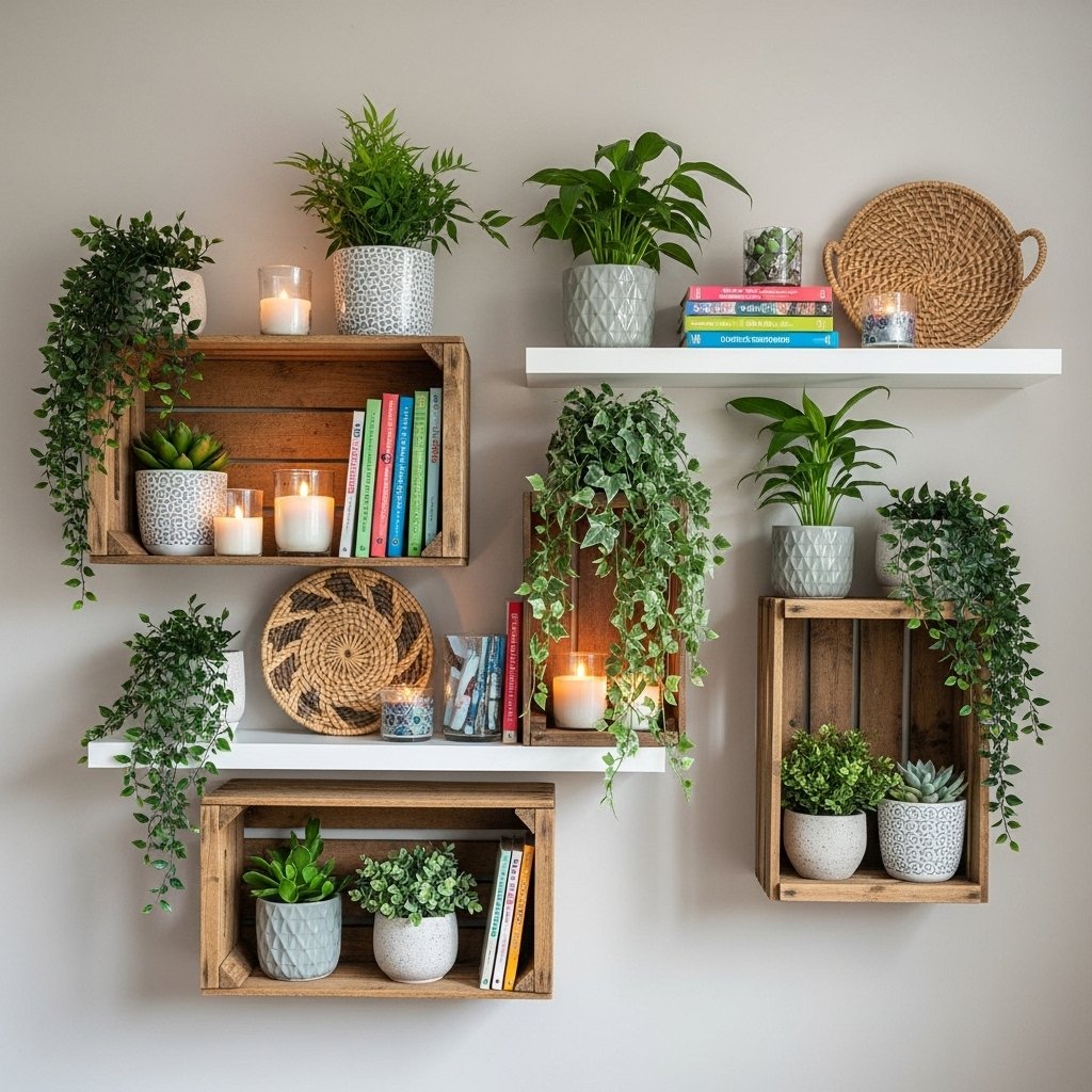 Adding wall shelves is both practical and decorative. Use wooden crates, floating shelves, or repurposed boxes to display small potted plants, books, or candles. Greenery brings life into the room while maintaining a cozy, natural aesthetic. You can mix textures by adding woven baskets or ceramic planters for visual interest. DIY plant shelves are perfect for corner spaces and can double as functional storage.