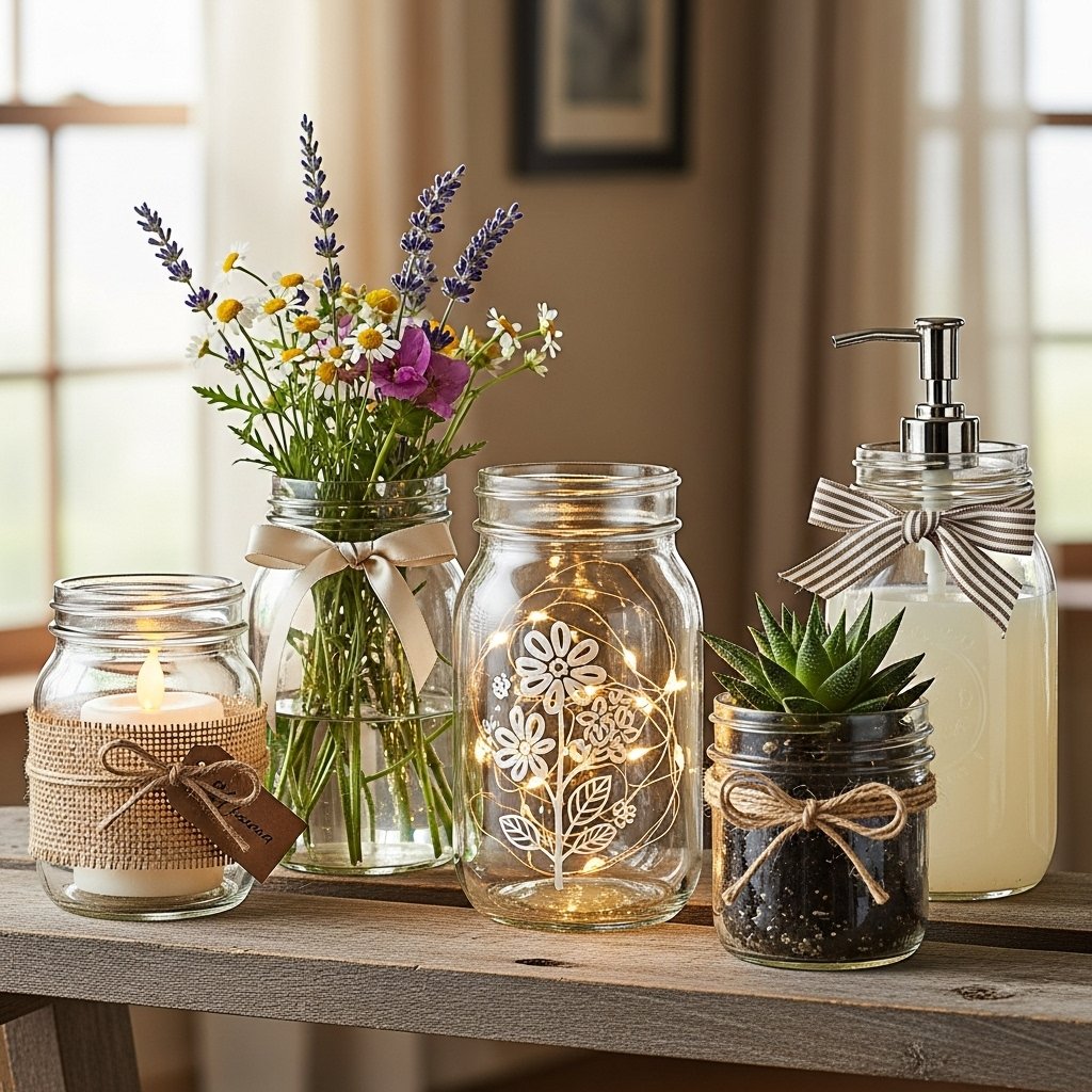 Mason jars are versatile, affordable, and perfect for DIY room decor. They can be used as candle holders, plant vases, fairy light jars, or storage containers. Painting or decorating the jars with twine, ribbons, or stickers adds an aesthetic touch. Grouping jars in different sizes creates a charming display on shelves, desks, or window sills. This simple project enhances the cozy vibe while adding functional decor.