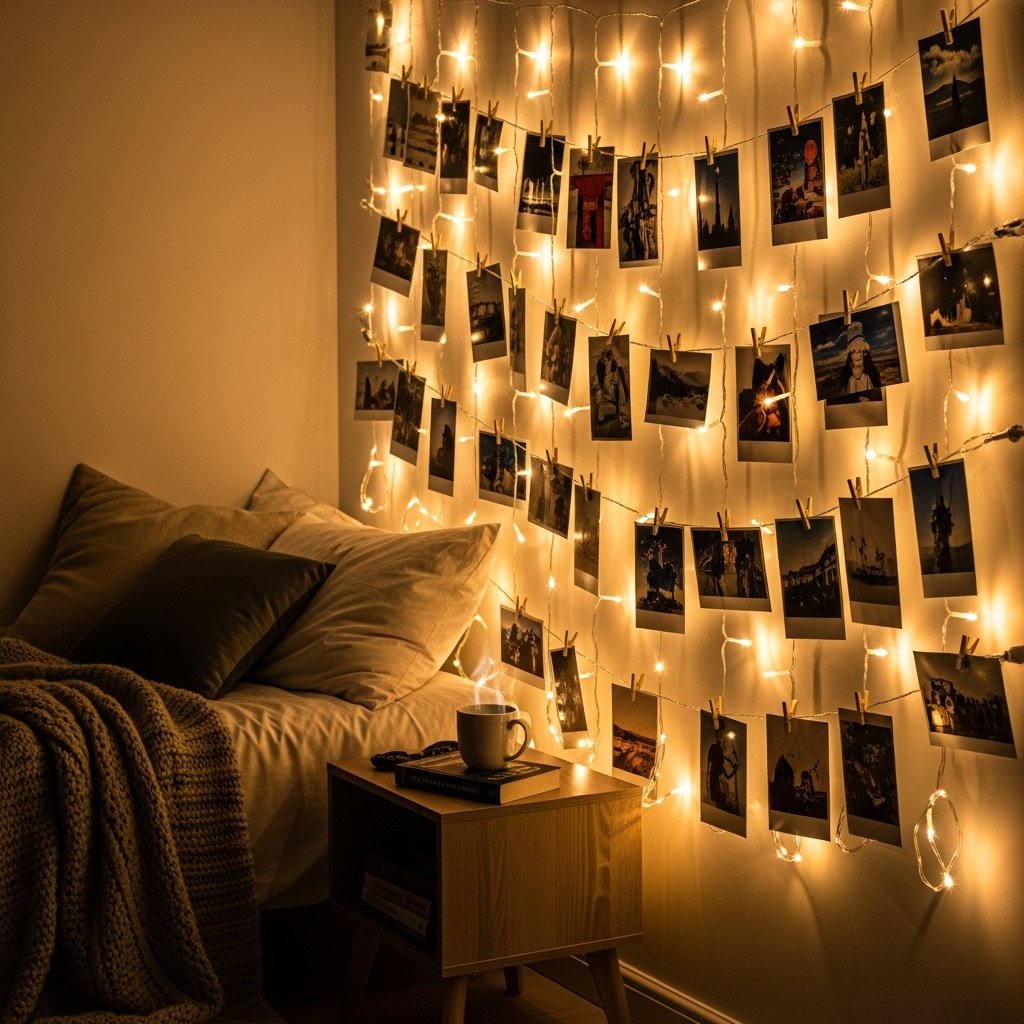 Fairy light wall decor is a simple and aesthetic DIY craft that creates a cozy and dreamy atmosphere. You can hang warm white fairy lights vertically and clip photos, notes, or postcards between them. This decor idea works beautifully at night and adds soft lighting to your room. It is affordable, easy to install, and instantly makes the space feel warm and inviting. Fairy lights are ideal for bedrooms, dorm rooms, or reading corners.