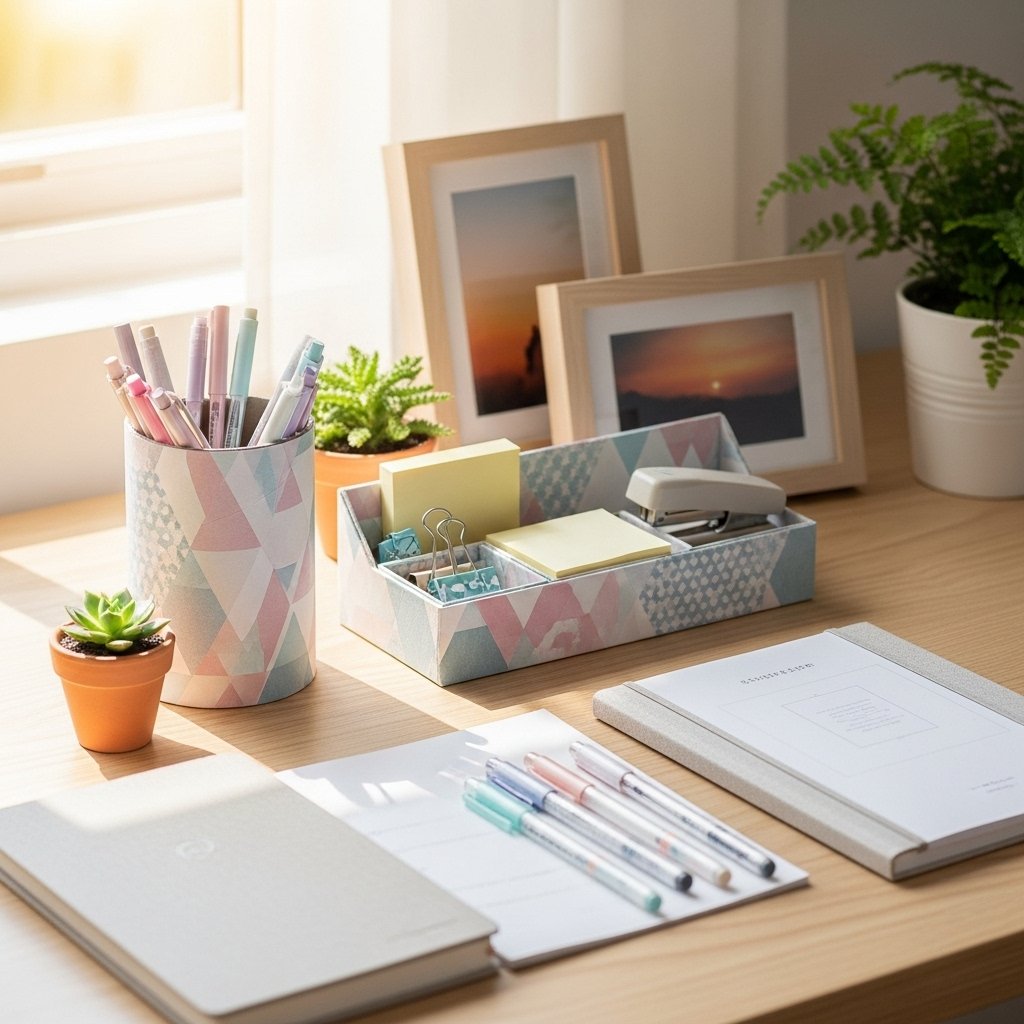 DIY desk decor helps transform your workspace into a productive and calming area. You can create pen holders using jars, cardboard, or small boxes and decorate them aesthetically. Adding small frames, plants, or handmade organizers keeps the desk neat and stylish. Soft color themes help reduce visual clutter and enhance focus. This DIY decor idea is perfect for study desks and home offices.