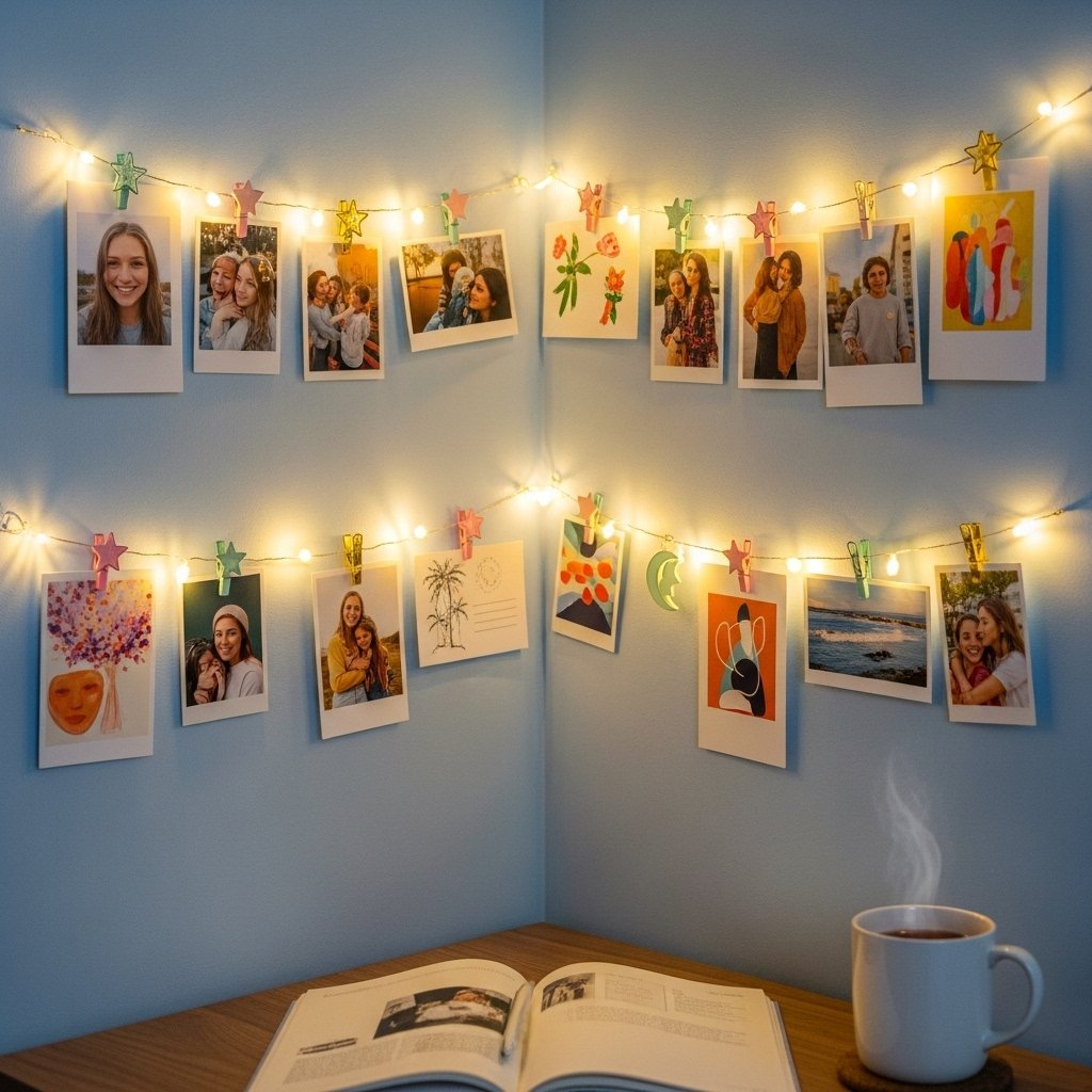 A string light photo display combines ambiance with personalization, making it a popular DIY room decor idea. Easy video tutorials show how to clip photos, postcards, or prints onto fairy lights. The lights create a warm glow, perfect for bedrooms, study corners, or dorm rooms. You can also customize with decorative clips or colored lights to match your room’s aesthetic. This craft is quick, affordable, and makes your favorite memories part of your everyday environment.