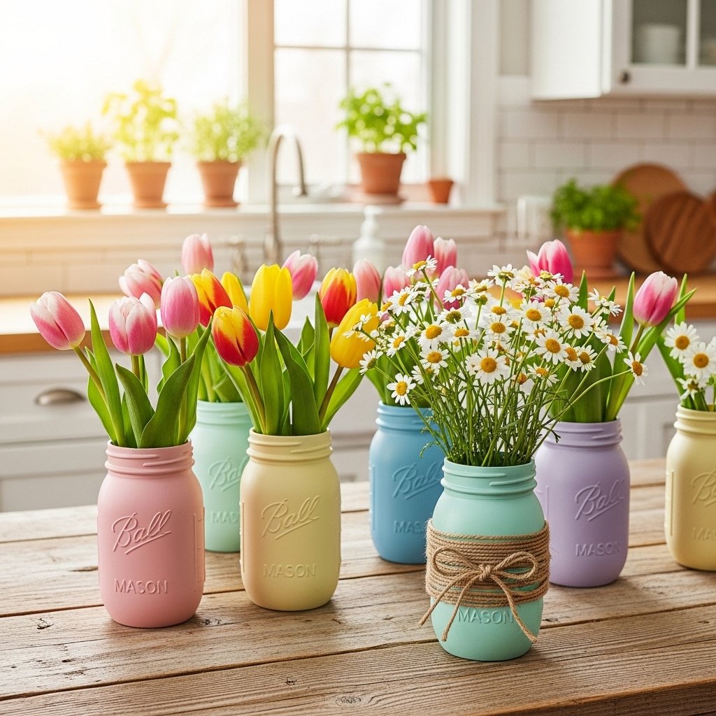 Mason jar flower arrangements are a charming and budget-friendly spring décor idea. Simply paint mason jars in pastel shades or wrap them with twine for a rustic farmhouse look. Fill them with fresh tulips, daisies, or artificial blooms to brighten up kitchen counters and dining tables. Grouping several jars together creates a fuller and more eye-catching display. This DIY spring decoration works beautifully in both modern and farmhouse-style homes.