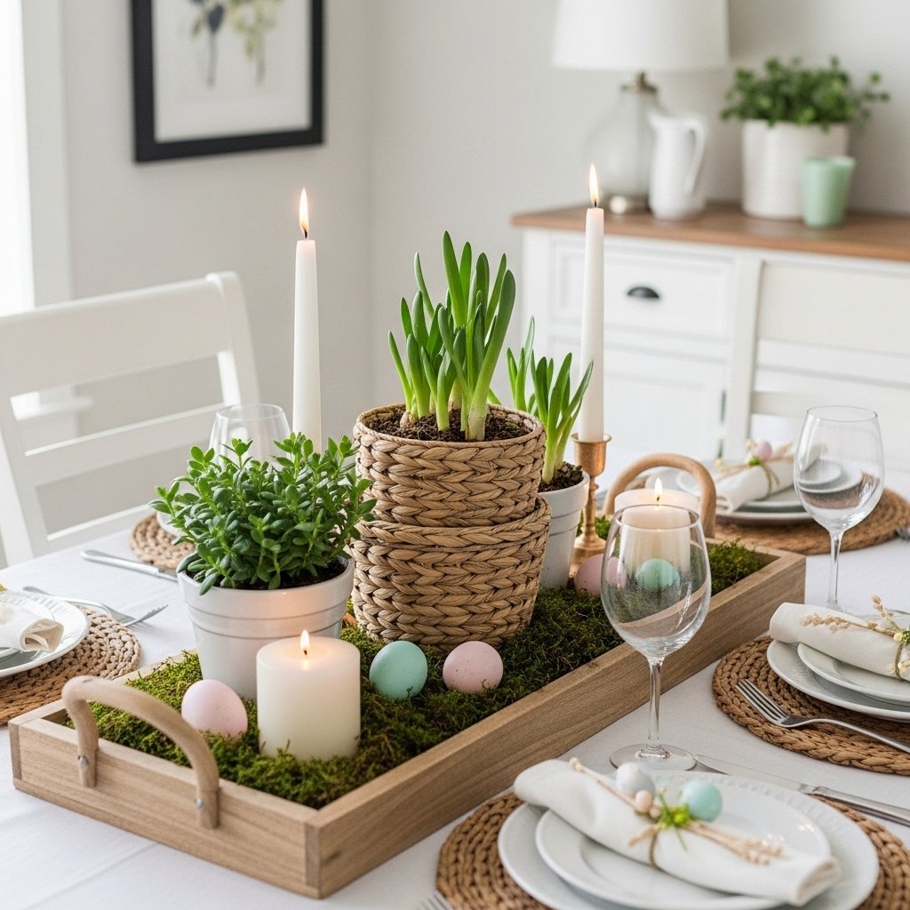 A DIY spring table centerpiece can instantly transform your dining area. Use a wooden tray or woven basket as a base and layer it with candles, flowers, and decorative eggs. Incorporating natural elements like moss, branches, or small potted plants enhances the seasonal feel. Keeping the color palette soft and cohesive ensures a clean and stylish look. This centerpiece works beautifully for everyday décor or spring gatherings.