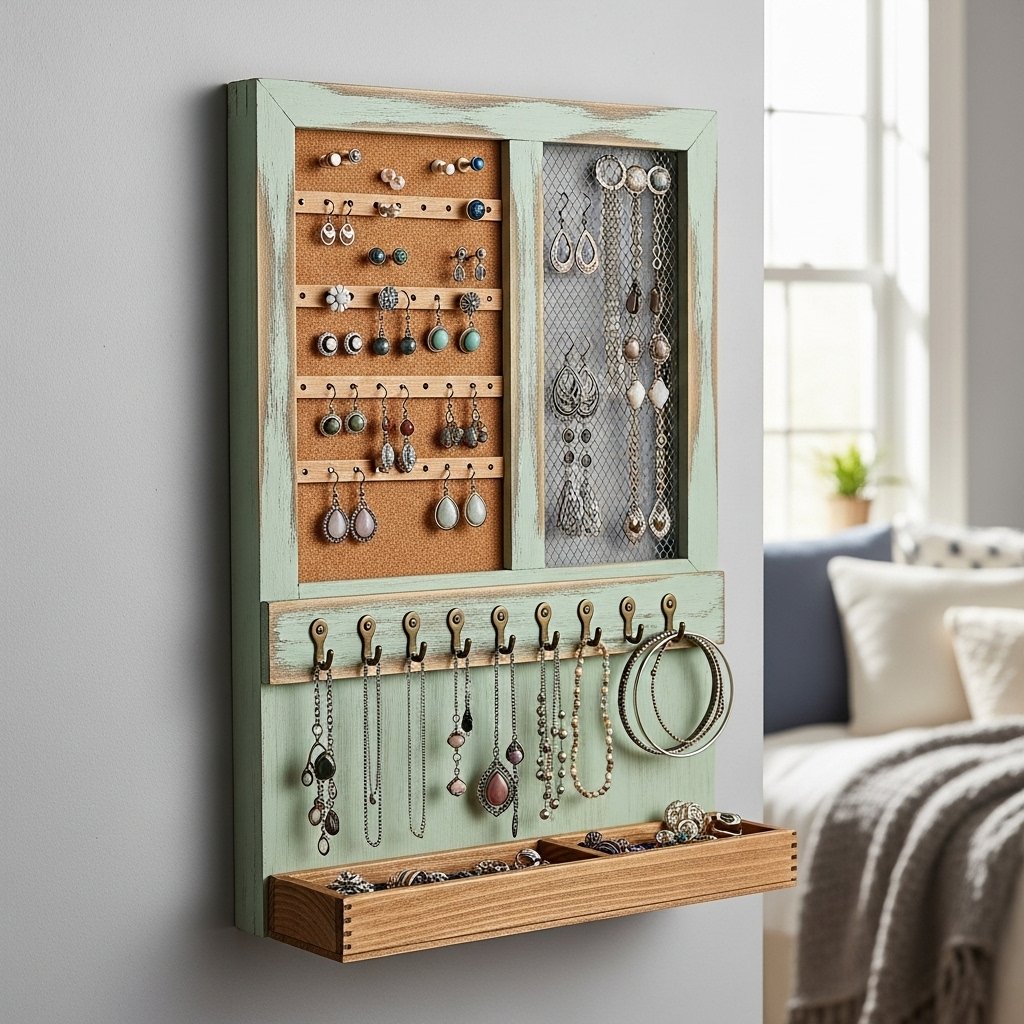 A jewelry organizer is both functional and decorative. Use a corkboard, mesh frame, or wooden board to hang earrings, necklaces, and bracelets. Paint or decorate the organizer to match your room style. This keeps your accessories neatly displayed while doubling as wall décor. It’s a practical DIY project that helps keep your bedroom tidy and stylish.