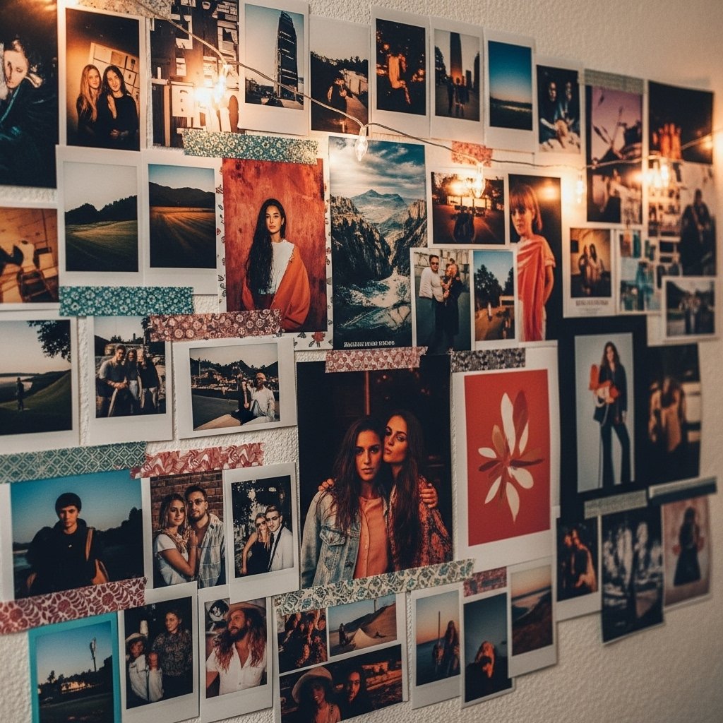 A photo collage is a simple way to display memories and decorate your walls. Collect your favorite prints, magazine cutouts, or Polaroids, and arrange them in a pattern. You can use string lights, washi tape, or frames to make the display more creative. This idea not only decorates the room but also adds a personal and sentimental touch. It’s a perfect DIY project for teens and adults alike.